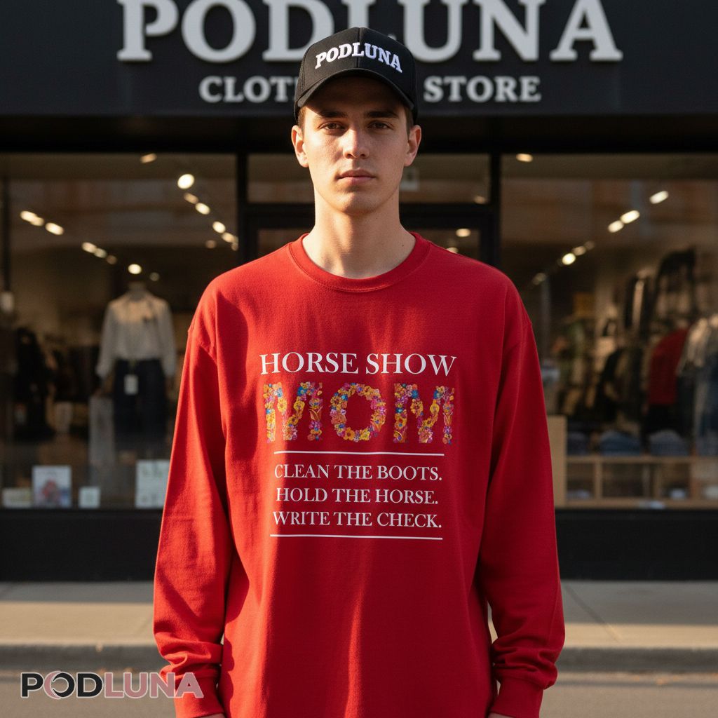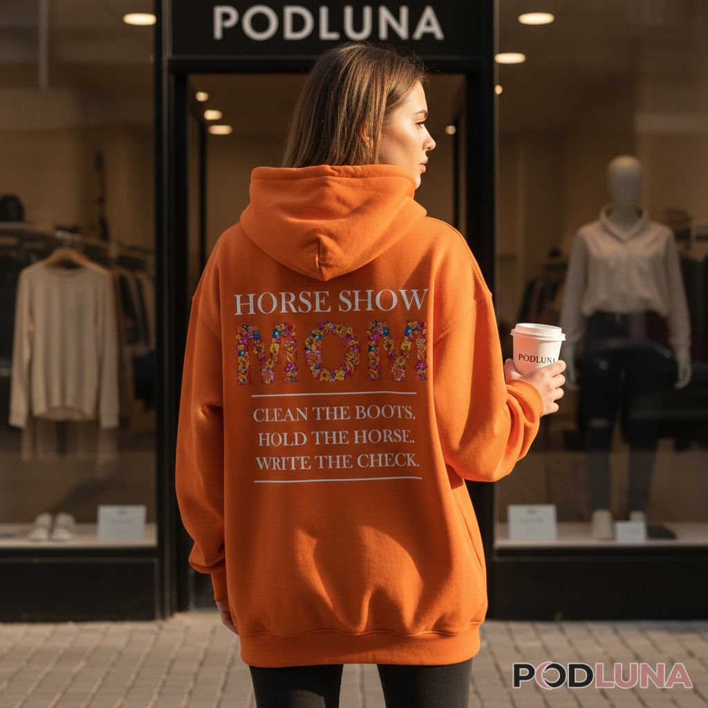 Behind every successful equestrian competitor stands a parent who has mastered the art of boot polishing, horse holding, and check writing. Designed for women whose children compete in horse shows, this shirt acknowledges the extensive behind-the-scenes support that makes competition day possible. Horse show moms don’t just watch from the sidelines—they ensure boots shine perfectly, steady nervous horses during last-minute adjustments, and fund this expensive passion one entry fee at a time. Podluna’s Horse Show Mom Clean Boots Hold Horse Write Check Shirt captures those realities with humor and beautiful floral typography. Perfect for mothers attending their children’s equestrian competitions, barn days preparing for shows, or casual wear celebrating your role in the equestrian world. The floral-filled “MOM” adds feminine beauty while the listed duties deliver relatable truth. Ideal gift for horse show moms who handle it all, great for Mother’s Day, end-of-season appreciation, or birthday presents for women who’ve mastered boot polish, horse management, and checkbook balance simultaneously.