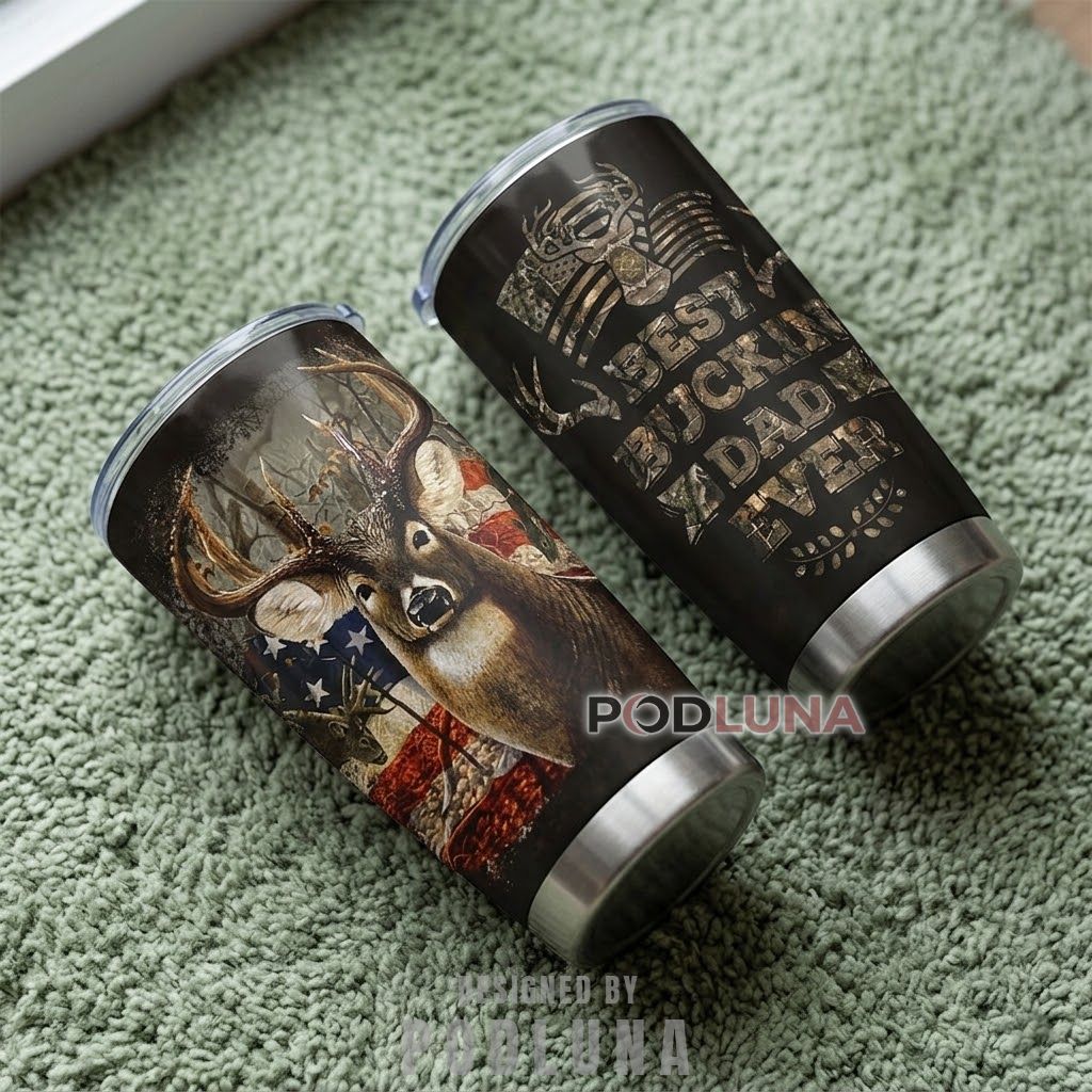 A striking hunting dad tumbler built for the outdoorsman who wears his identity without apology, this insulated drinkware features a photorealistic whitetail buck rendered against a distressed American flag backdrop in deep earth tones of black, brown, rust red, and aged gold on one side, while the other carries camo-textured block lettering declaring “Best Buckin Dad Ever” crowned by an ornate deer skull emblem on a solid black background. The dark, rugged color palette and detailed wildlife artistry make this deer hunting dad tumbler feel like it belongs in a truck cup holder at 5am, which is exactly where it will end up.