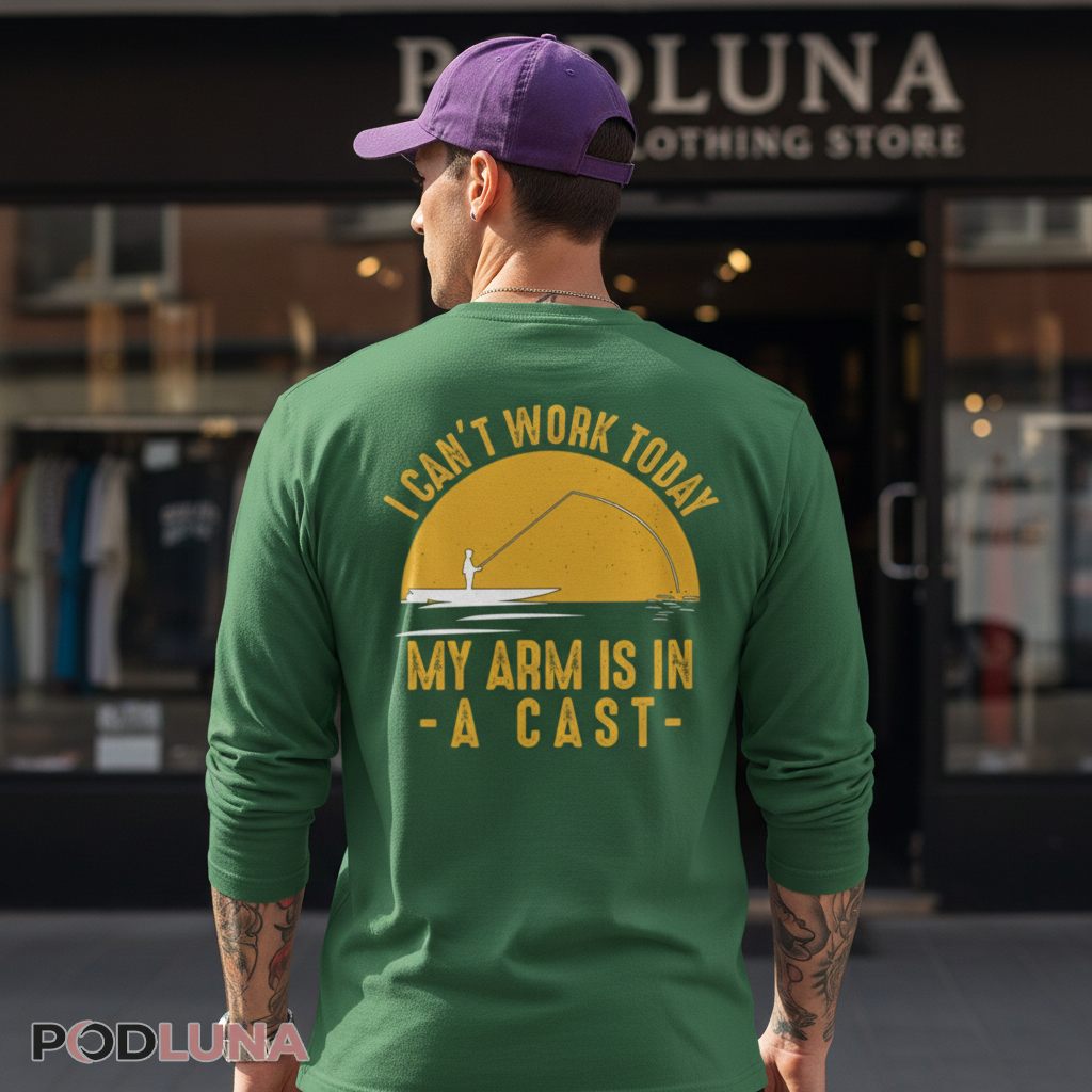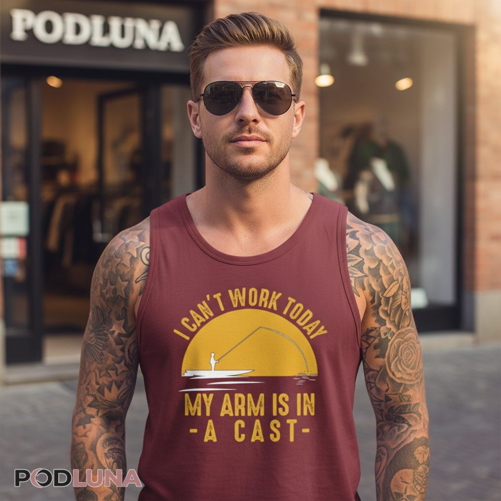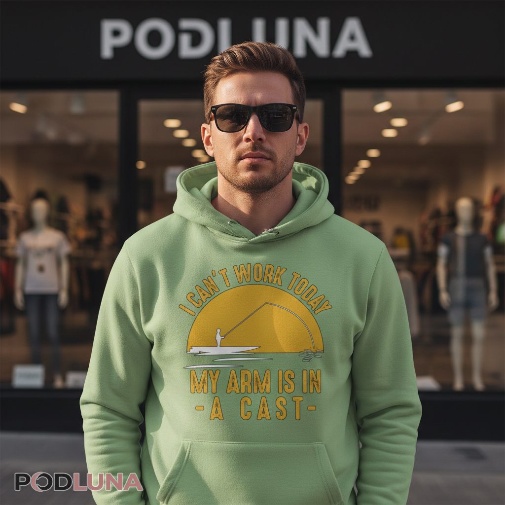 A clever wordplay design transforms this t-shirt into the perfect excuse for anglers who prioritize fishing over workplace obligations. The composition features golden-yellow text reading “I CAN’T WORK TODAY” arcing above a circular sunset or sunrise backdrop in warm amber tones. Within this glowing circle stands a solitary angler silhouette on what appears to be a small boat or platform, rod extended in classic casting position with fishing line arcing through the air. Below, “MY ARM IS IN” sits above the punchline “-A CAST-” in bold letters with decorative dashes, delivering the double meaning that makes fellow fishermen grin—this cast involves fishing line, not medical plaster. The sunset imagery and lone figure create a peaceful contrast to the humorous absence excuse, suggesting where the wearer would genuinely rather spend their day than behind a desk or in meetings.