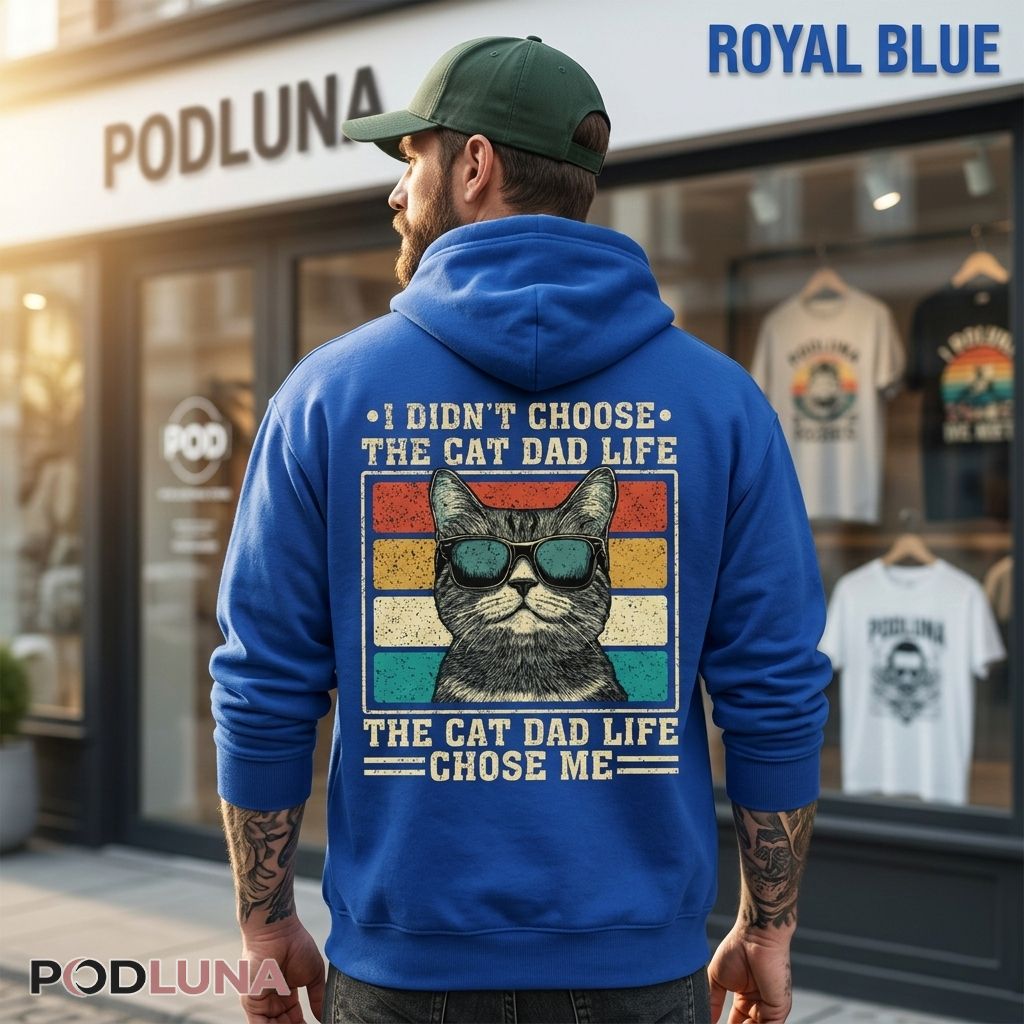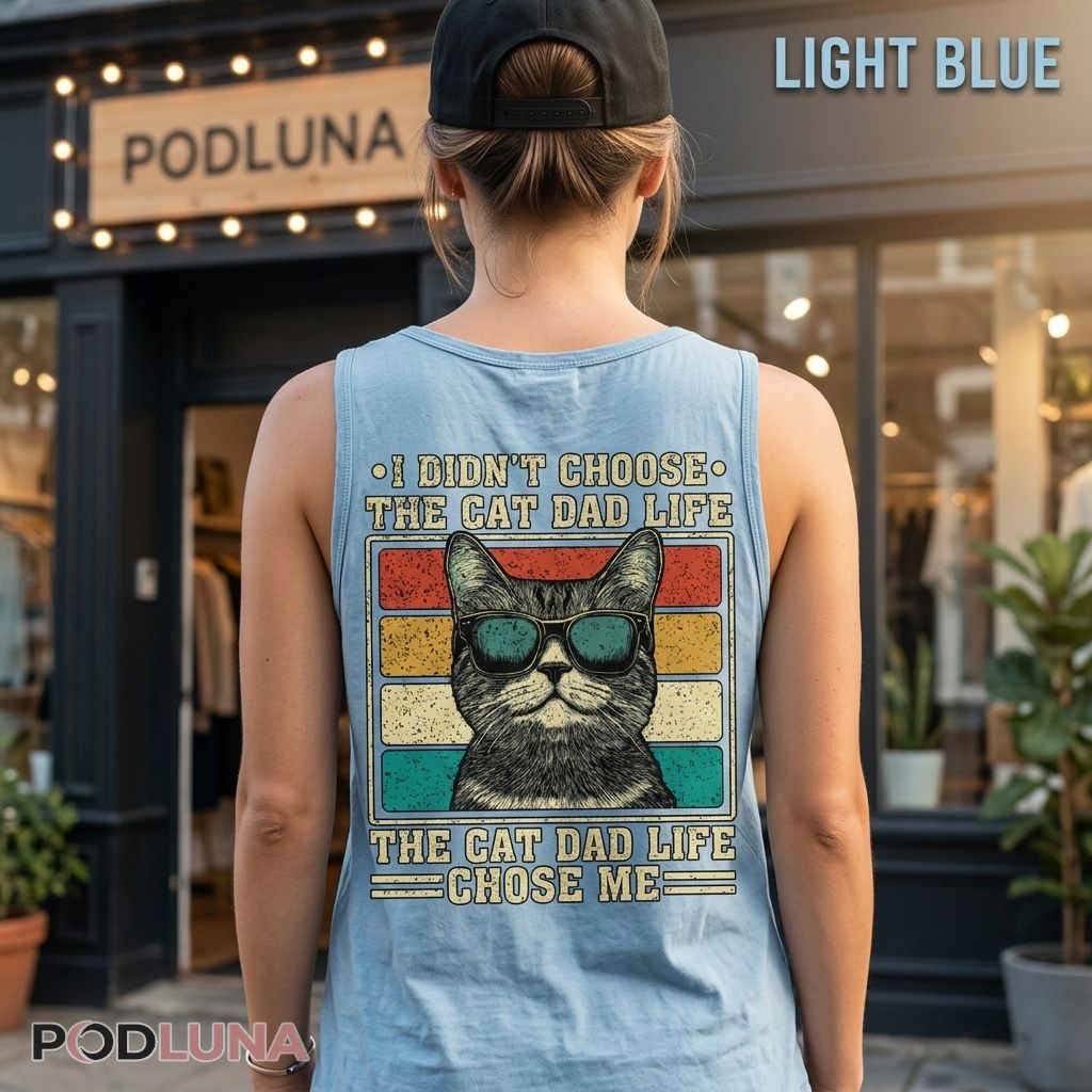 A cat dad shirt owning the most universal truth in feline ownership with retro cool and zero regret. The design features a confident grey cat wearing teal aviator sunglasses set inside a vintage stamp-style frame with layered retro stripe tones. “I DIDN’T CHOOSE THE CAT DAD LIFE” leads across the top with bullet point accents, “THE CAT DAD LIFE CHOSE ME” anchors the bottom with dash accents — the classic format landing with the resigned pride of someone who walked into this completely unprepared and would not change a single thing.