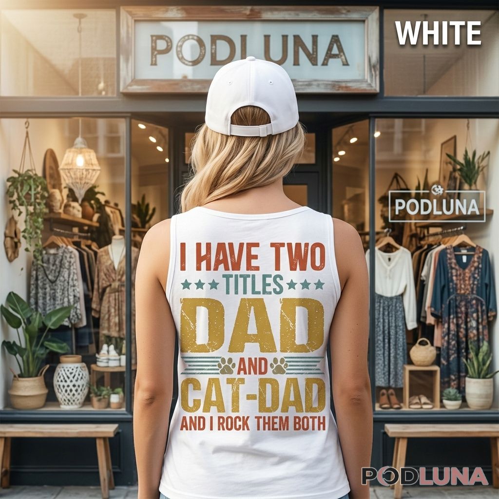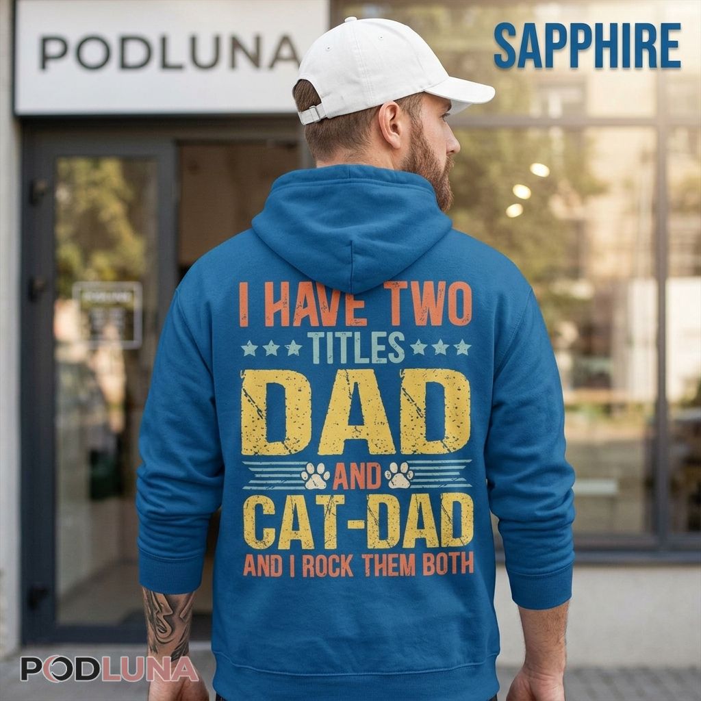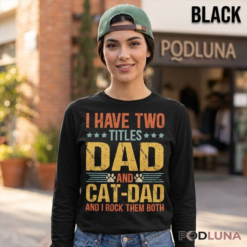 A cat dad shirt celebrating the double title with vintage attitude and zero humility. The design stacks the declaration in bold multicolor distressed lettering across a full back print: “I HAVE TWO TITLES” leads at the top, “DAD” dominates the center in oversized block text, “AND CAT-DAD” follows below with paw print accents on each side, and “AND I ROCK THEM BOTH” closes the statement at the bottom — the graduated sizing giving the whole composition the weight each title deserves.