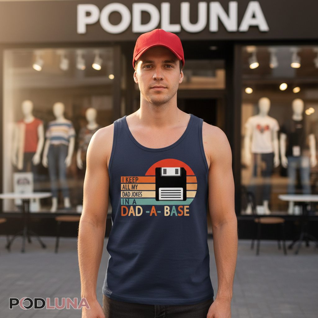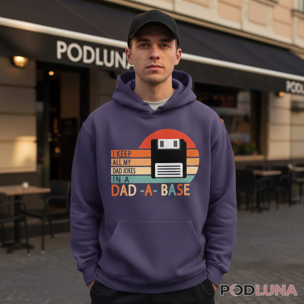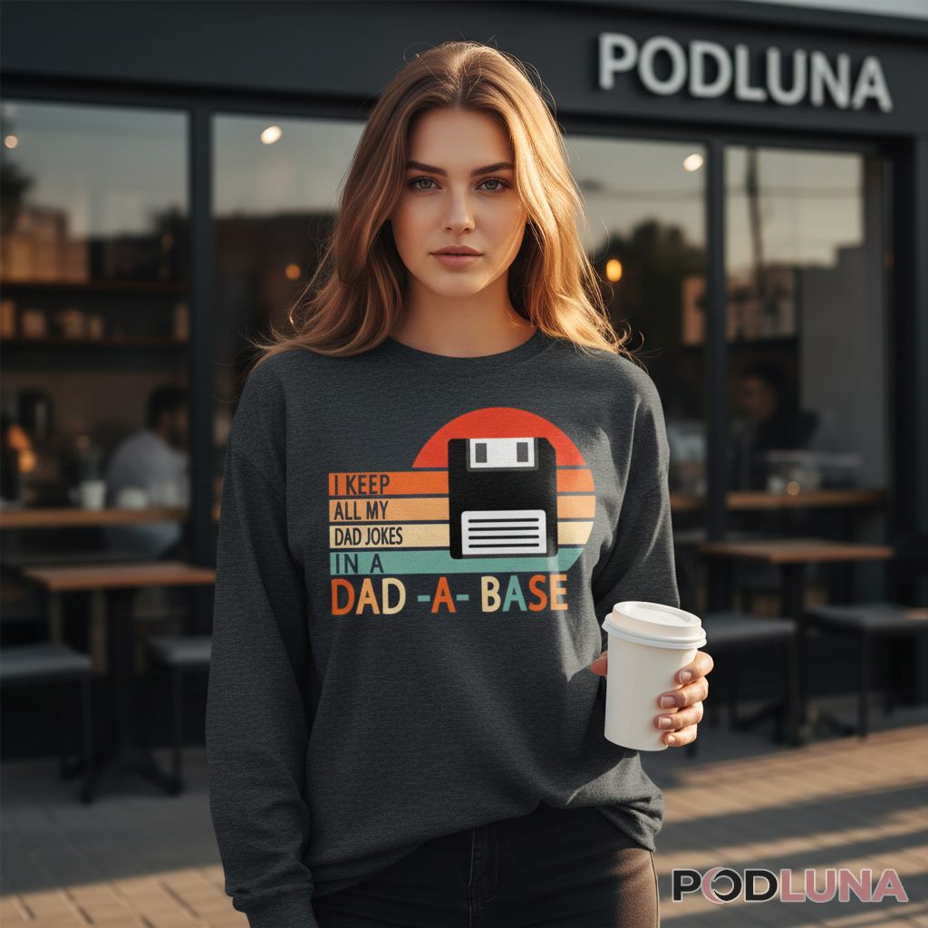 Dad jokes need proper storage, and apparently they’re saved on vintage technology. This i keep all my dad jokes in a dad a base t-shirt features a retro floppy disk graphic with “I Keep All My Dad Jokes In A Dad-A-Base” text against sunset stripes, combining tech nostalgia with classic father humor. It’s a double-layered pun that appeals to dads who remember the ’80s and ’90s while still delivering groan-worthy wordplay.