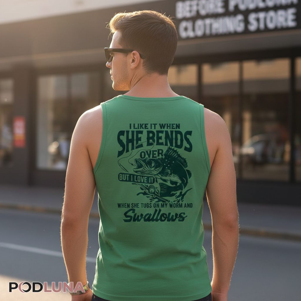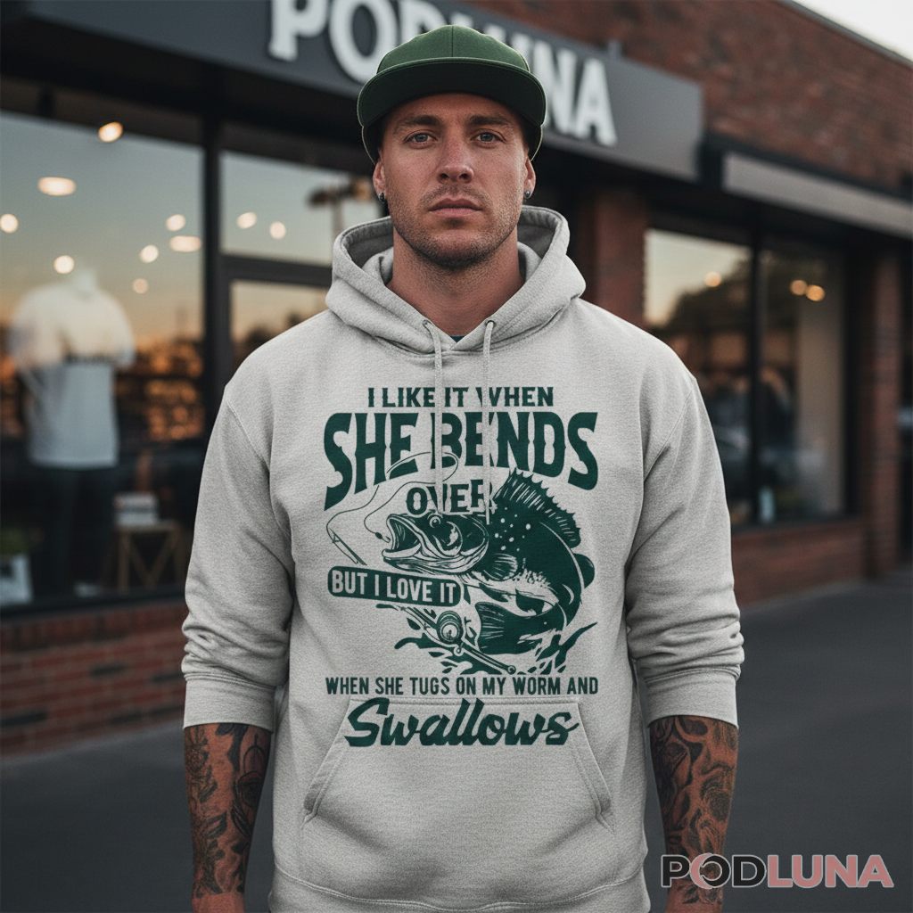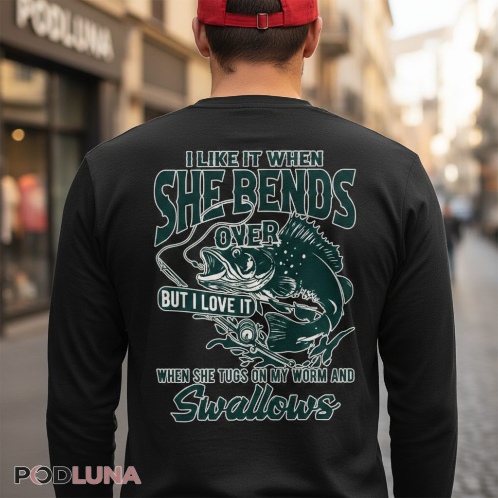 A provocative fishing pun transforms this t-shirt into an attention-grabbing conversation starter that delivers unexpected humor. The design opens with “I LIKE IT WHEN SHE BENDS OVER” in bold lettering that immediately catches eyes and raises eyebrows, creating deliberate anticipation. A detailed illustration of a leaping bass dominates the center, mouth wide open and body curved in an aggressive strike pose, surrounded by splashing water effects that convey explosive action. The phrase “BUT I LOVE IT” appears integrated into the composition, building toward the reveal. Below, the punchline lands: “WHEN SHE TUGS ON MY WORM AND Swallows” in mixed typography that clarifies this “she” refers to fish, not romance. The bass illustration reinforces the fishing context while the carefully structured text creates comedic timing through the bait-and-switch setup that makes anglers laugh once they realize the entire message celebrates that perfect moment when a fish commits fully to the bait.
