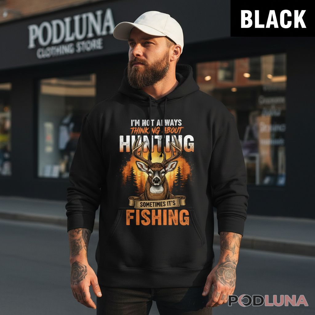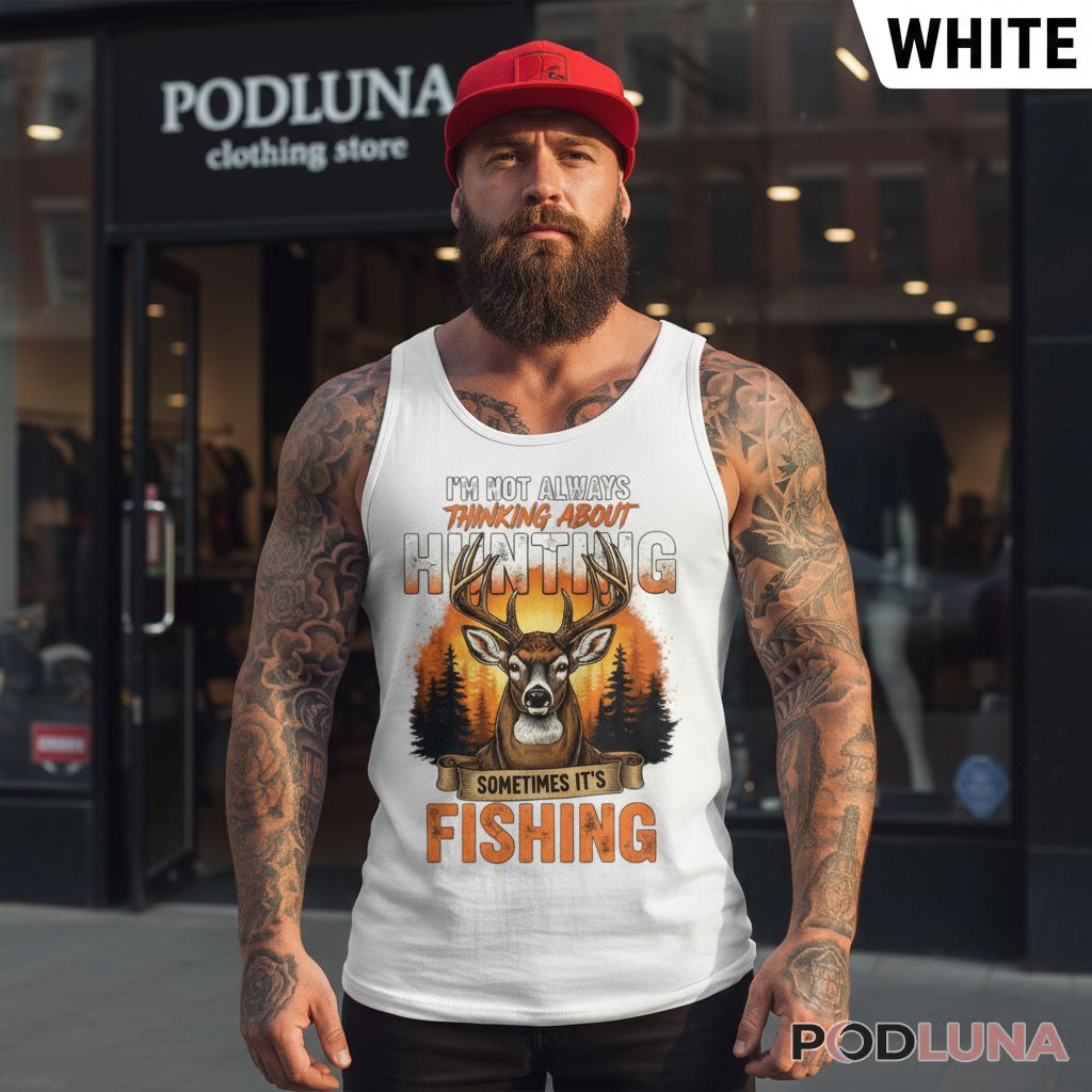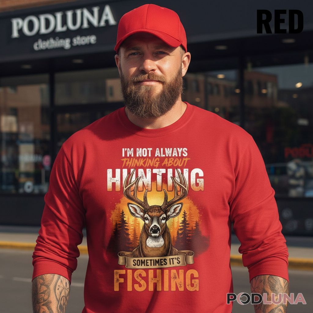 A hunting and fishing dad shirt delivering the most relatable confession any outdoorsman has ever made. The design features a detailed whitetail buck portrait front and center, staring straight ahead against a warm golden sunset forest scene with pine tree silhouettes. “I’M NOT ALWAYS THINKING ABOUT HUNTING” leads across the top in bold layered lettering, “SOMETIMES IT’S FISHING” closes the admission below on a scroll banner — the two-line format landing as the most honest thing a hunting fishing dad has ever worn.