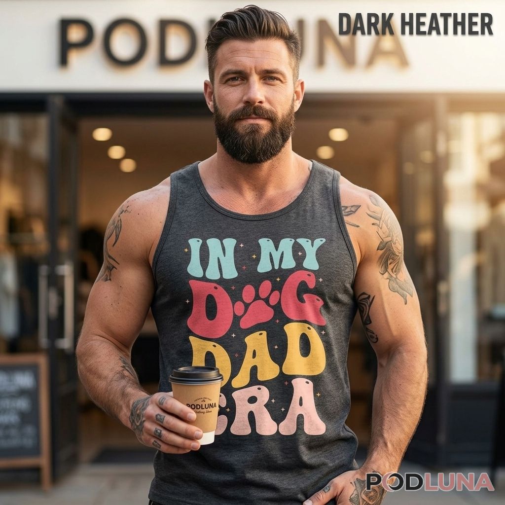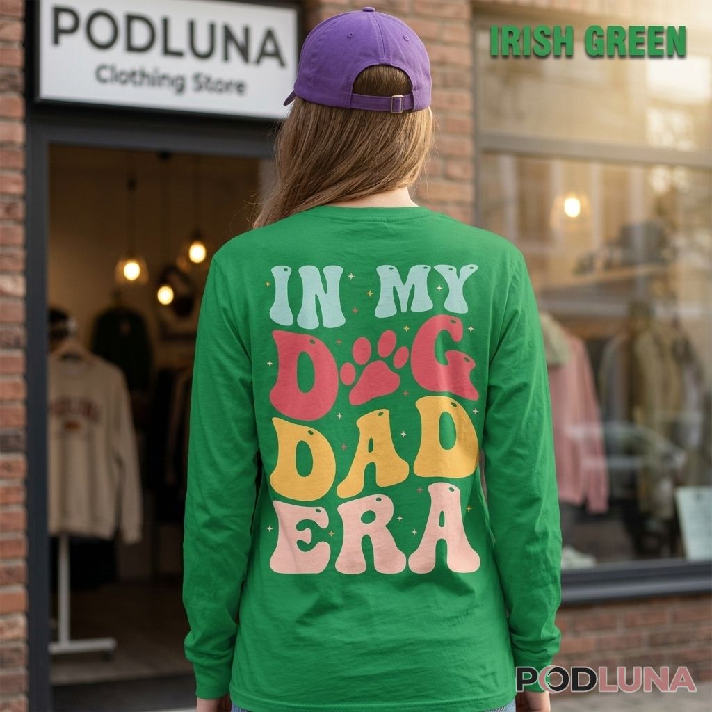 The In My Dog Dad Era shirt captures the most culturally current and personally committed identity statement any dog lover has ever put on their back. The design fills the entire back with “IN MY DOG DAD ERA” in oversized retro groovy bubble lettering — each word stacked in its own line, each line rendered in a different warm pastel tone, a paw print replacing the O in DOG — the chunky rounded font and scattered star accents giving the whole composition the nostalgic warmth of something that feels both trendy and timeless simultaneously.