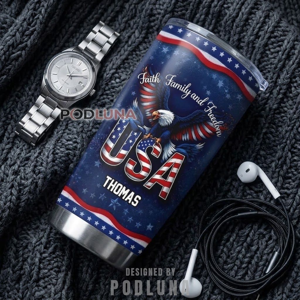 Three words that belong in this exact order for the people who live by them. The eagle spreading its wings over “USA” while that phrase arches above is not a design choice made for aesthetics, it is a sequence that describes a life priority list carried into every day. Seeing a personal name beneath it confirms what the design is already saying: this belongs to a specific person, with specific values, who drinks their coffee every morning knowing exactly where they stand. Podluna built this custom patriotic tumbler for that person.