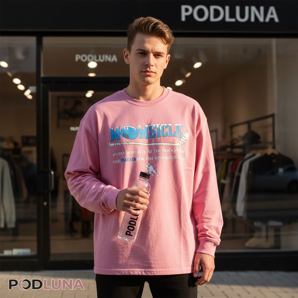 Creative wordplay combines with hockey imagery on this relaxed-fit crew neck, featuring “MOMSICLE” in large outlined letters with a hockey puck cleverly replacing the ‘O’. A hockey stick graphic extends diagonally from the title, adding athletic context to the playful term. Below this, white text reads “A MOM WHO SITS AT THE HOCKEY RINK” on the first line, followed by “AND FREEZES FOR THE LOVE OF HER SON” on the second line. A small illustration of a hockey player in action pose appears beneath the text, showing skating motion with stick handling. The Momsicle #1 Fan Freezes At The Hockey Rink Shirt uses lighthearted humor to acknowledge the physical discomfort mothers endure supporting their young athletes, transforming “popsicle” into a badge of maternal dedication.