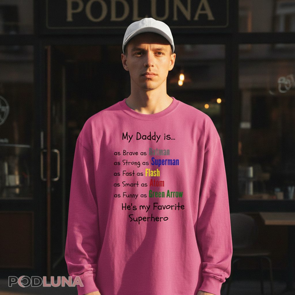 This isn’t your average Father’s Day gift—it’s a wearable love letter from kids who genuinely think their dad has superpowers. The My Daddy Is My Favorite Superhero Brave Strong Fast Smart Shirt captures how children see their fathers through that magical lens where dad really can do anything. Perfect for young kids attending family gatherings, school events, or just hanging out at home, this design from Podluna speaks their language by connecting dad’s everyday heroism to the characters they already admire. It’s ideal for toddlers and elementary-aged children who want to show off their pride in a way that feels both genuine and fun.