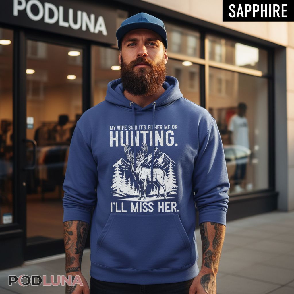 A sarcastic hunting dad shirt landing one of the most legendary ultimatums in outdoor marriage history. The design features a detailed whitetail buck standing in a mountain wilderness scene with pine trees and a rifle scope crosshair overlay, rendered in clean distressed illustration style. “MY WIFE SAID IT’S EITHER ME OR HUNTING.” sets up the premise across the top, while “I’LL MISS HER.” delivers the punchline below with devastating comic timing — two lines, zero hesitation, maximum hunting dad energy.