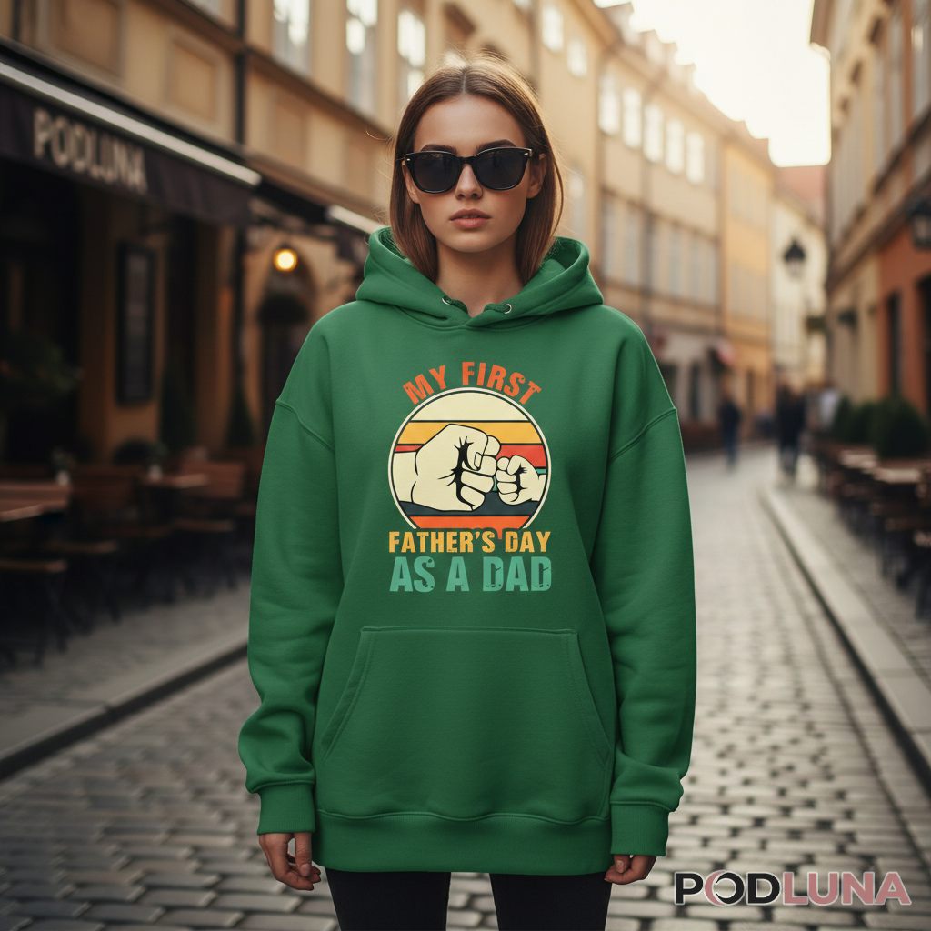 A t-shirt showcasing a nostalgic design that celebrates a milestone moment in fatherhood. The graphic centers around an illustration of an adult fist bumping with a tiny baby fist, enclosed within a circular badge. Behind the hands sits a vintage sunset gradient with horizontal stripes in warm tones of orange, yellow, and red. Text elements frame the image with “MY FIRST” arching across the top in coral lettering, while “FATHER’S DAY” appears in bold yellow-gold below the circle, and “AS A DAD” finishes the composition in mint green at the bottom. The typography combines retro-inspired fonts with varying colors that complement the sunset palette, creating a cohesive 70s-influenced aesthetic throughout the entire design.