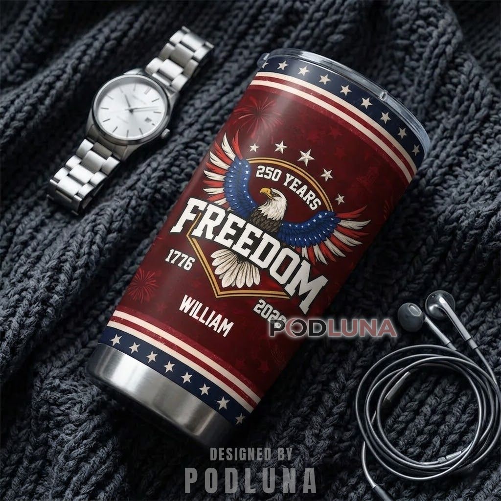 There is a reason varsity lettering has always felt like belonging to something. “Freedom” spelled out that large, in that weight, with that eagle spreading its wings directly above it, reads less like a word and more like a declaration of membership. Adding a personal name below the dates completes the statement, this is not just America’s anniversary, it is yours too. Podluna designed this personalized freedom tumbler for the person who carries that sense of ownership in everything they do, including what they drink from every morning.