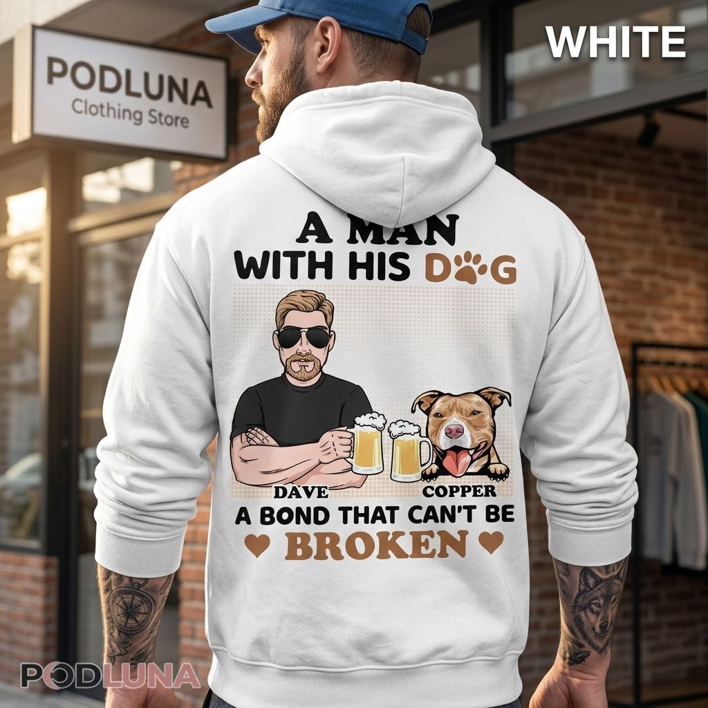 The A Man With His Dog shirt captures the most unbreakable partnership in a man’s life with warmth, humor, and a cold beer between them. The design features a cartoon illustration of a bearded man in sunglasses with arms crossed beside his dog — both named below their figures, both with a frothy beer mug between them as the shared centerpiece — set against a dotted backdrop with “A MAN WITH HIS DOG” leading across the top, a paw print replacing the O in DOG, and “A BOND THAT CAN’T BE BROKEN” anchoring the bottom with a heart accent.