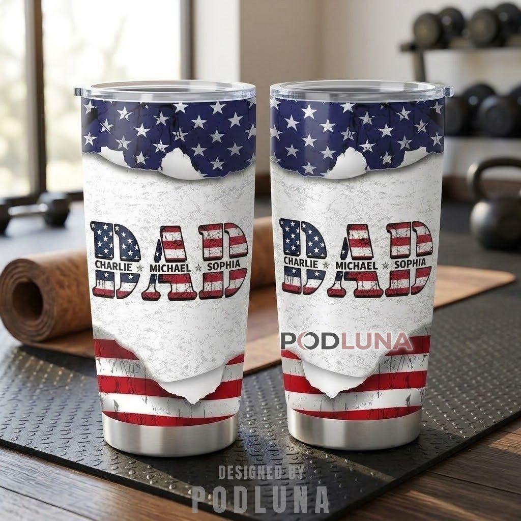 For the father who takes pride seriously, in his country and in his family, this tumbler holds both in the same frame. Podluna built this personalized American flag dad tumbler so the names of his kids are printed right where they belong: directly under the title he earned. Every star on this design has company.