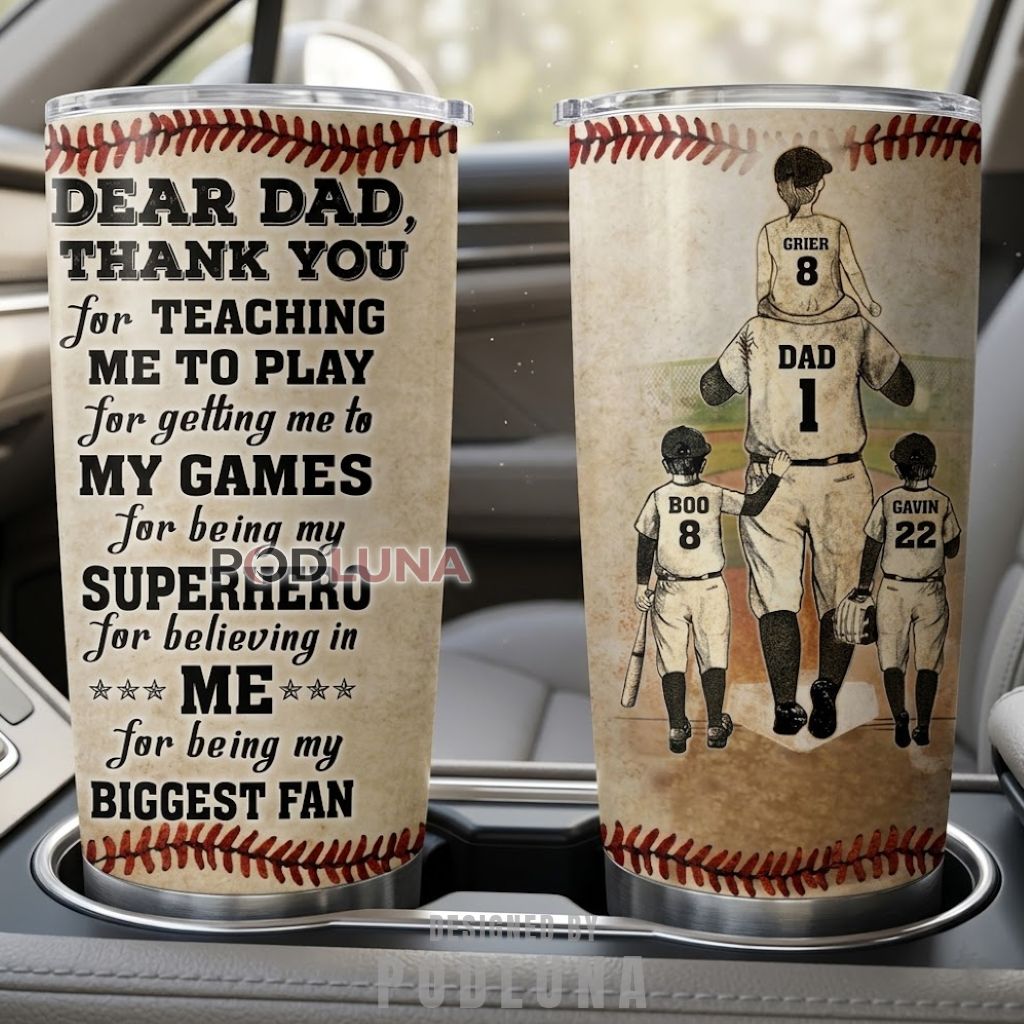 This personalized baseball dad tumbler pairs a vintage parchment and baseball stitch texture with a heartfelt message listing every reason a dad deserves a thank you, from teaching the game to showing up at every game, printed in layered bold and script typography across one full panel. The reverse carries a custom illustration of dad walking onto the diamond with his kids in full uniform, each one wearing a personalized jersey number and name, with one small player riding high on his shoulders where the view is best.