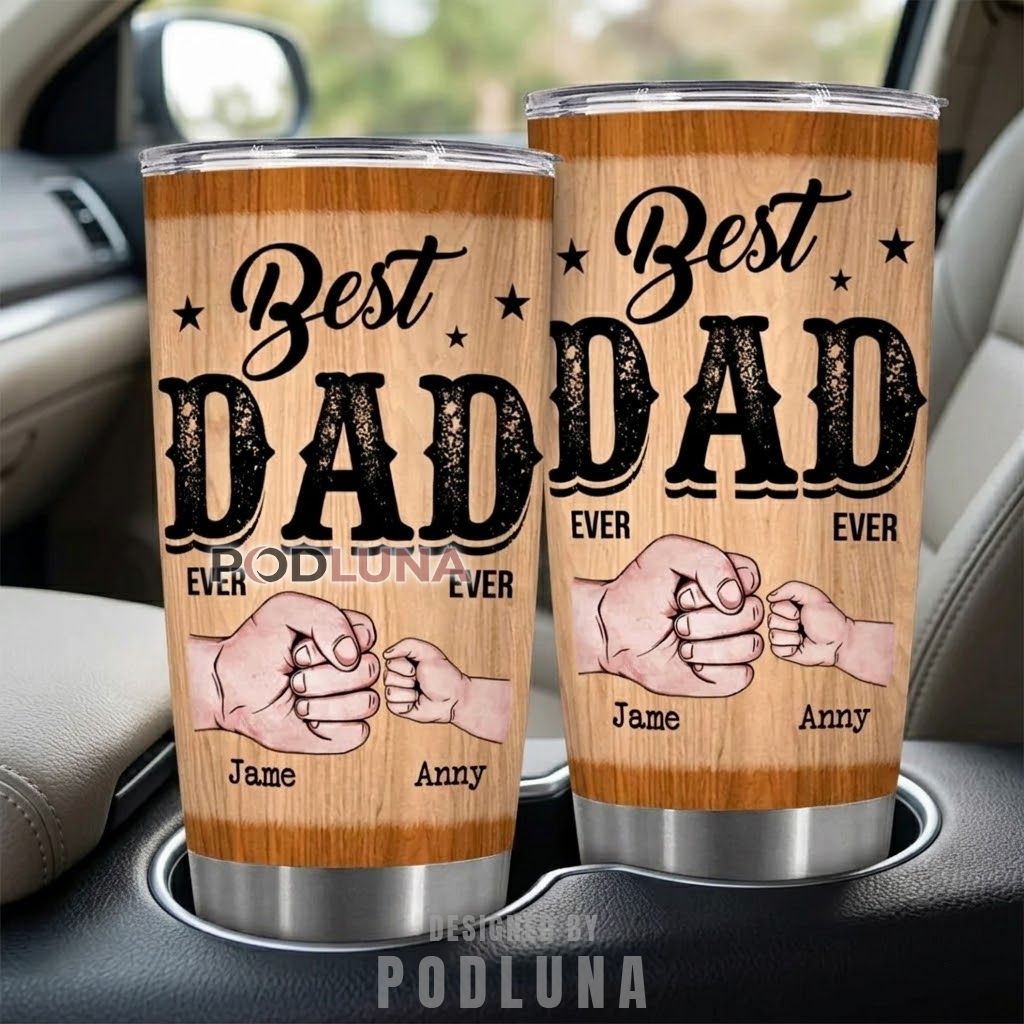 This personalized best dad ever tumbler wraps a warm oak woodgrain texture around a bold distressed typography treatment spelling out “Best Dad Ever” in layered script and block lettering, flanked by star accents on both sides. Below the title, an illustrated fist bump between a large hand and two smaller ones anchors the design, with each custom kids’ name printed directly beneath their own fist, making this a best dad gift that turns a single gesture into a permanent record of who he does it for.
