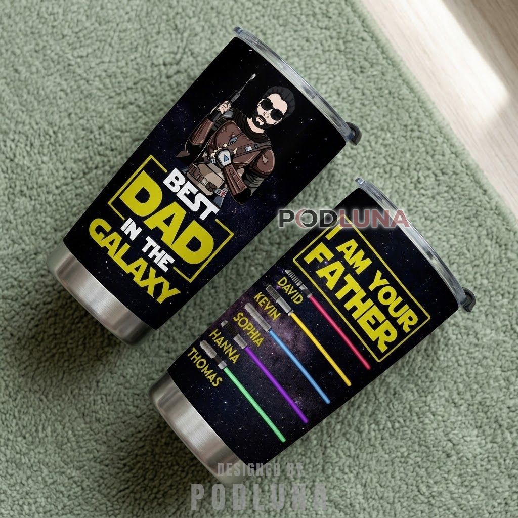 This personalized best dad in the galaxy tumbler wraps a deep star-field surface around a cartoon warrior dad illustration on one side, framed by bold yellow sci-fi block lettering declaring him the best dad in the galaxy, while the reverse panel stacks every child’s custom name beside their own individual lightsaber rendered in a distinct color, topped by the declaration “I Am Your Father” in the same cinematic yellow title treatment. The dual-panel layout makes this a custom kids names dad gift that delivers equal parts humor and genuine sentiment without having to choose between them.