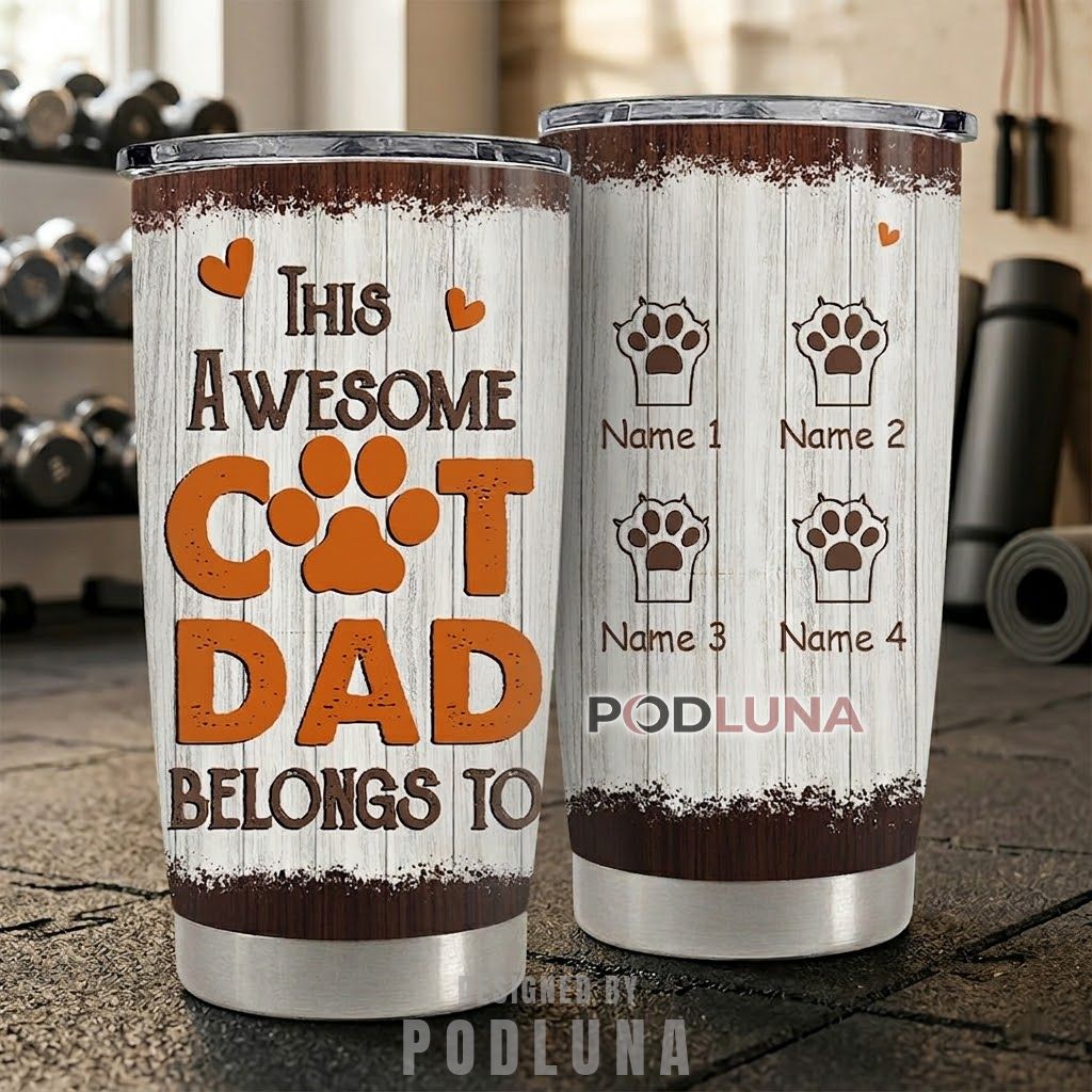 A warm, rustic personalized cat dad tumbler wrapped in a whitewashed vertical wood plank texture with rich dark brown border bands, this insulated drinkware features hand-lettered typography reading “This Awesome Cat Dad Belongs To” with a bold orange paw print replacing the letter O in “Cat” on one side, while the other displays four custom cat paw print icons each paired with an individual cat name. The earthy orange, cream, and deep brown color palette with small heart accents gives this funny cat dad tumbler a cozy, lived-in charm that feels as comfortable as the cats who inspired it.