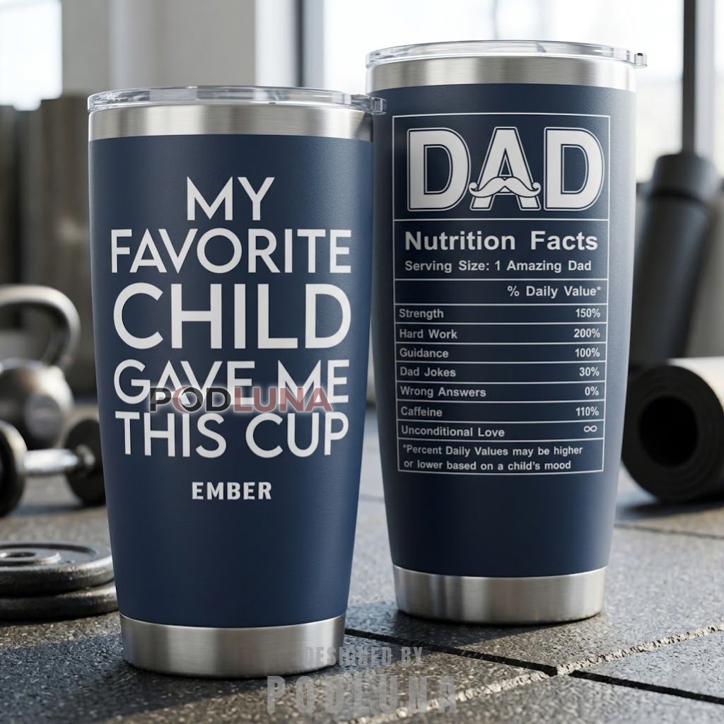 This personalized dad tumbler keeps the design clean and the joke loud, with “My Favorite Child Gave Me This Cup” printed in oversized bold white block lettering across a deep navy surface, the custom giver’s name sitting confidently below as the only evidence needed. The reverse runs a full “Dad Nutrition Facts” panel listing Strength at 150%, Caffeine at 110%, Dad Jokes at a humble 30%, Wrong Answers at 0%, and Unconditional Love at infinity, with a footnote clarifying that daily values may be higher or lower based on a child’s mood.