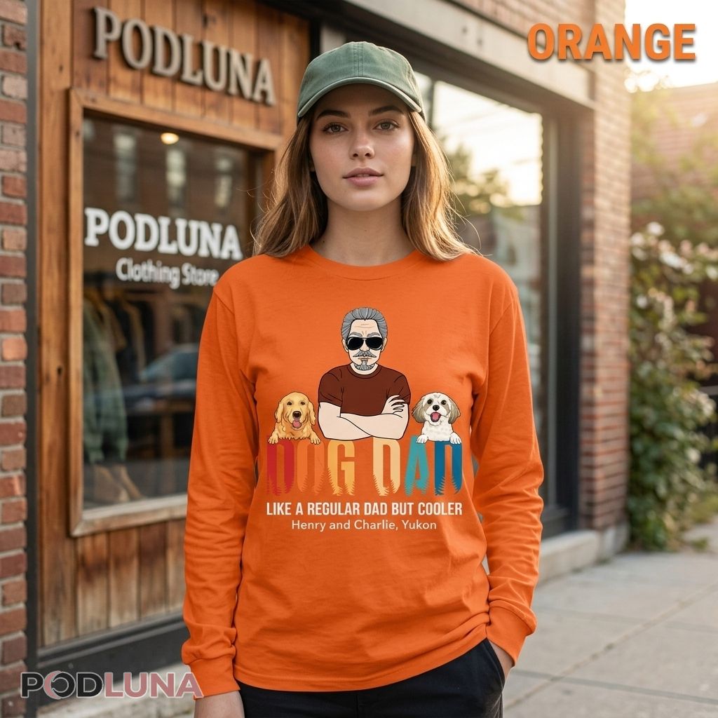 The Personalized Dog Dad Like A Regular Dad But Cooler shirt delivers the coolest back-print portrait any multi-dog owner has ever worn out in public. The design features a cartoon illustration of a cap-wearing man in sunglasses standing arms crossed with two dogs peeking up from inside the large bold lettering spelling “DOG DAD” in warm retro gradient tones, pine tree silhouettes filling the letters, all names displayed below in flowing script. “LIKE A REGULAR DAD BUT COOLER” anchors the bottom, the whole composition functioning as both a title and a crew portrait simultaneously.
