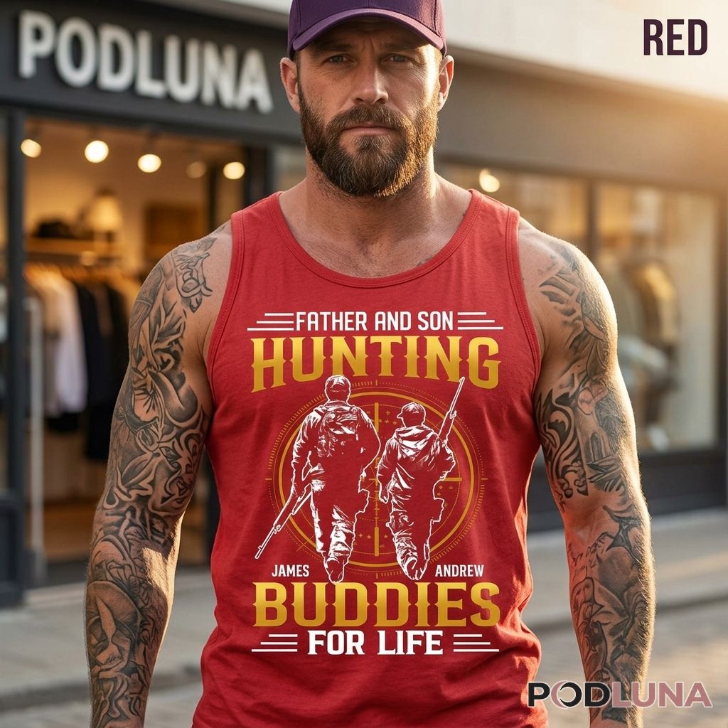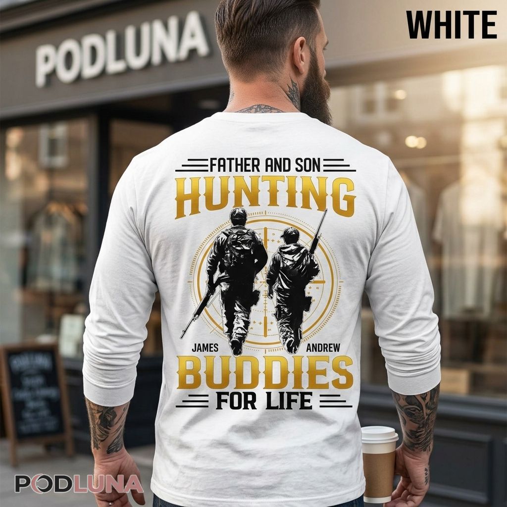 A personalized father and son hunting shirt honoring the most unbreakable partnership in the field. The design features two hunters walking side by side from behind — a taller figure and a smaller one, rifles in hand, heading into the hunt together — set inside a bold rifle scope crosshair circle. “FATHER AND SON” sits at the top with dash accents, “HUNTING” dominates the center in large gold lettering, with each hunter’s personalized name displayed beneath their silhouette, and “BUDDIES FOR LIFE” closing the design with dash accents below — the whole composition capturing a bond that no season ever breaks.