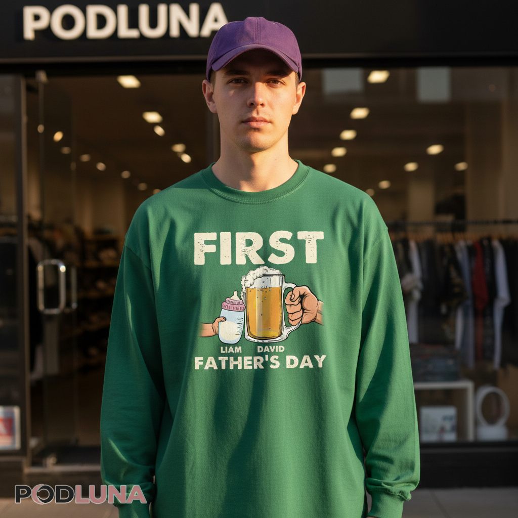 This tee displays a humorous graphic that perfectly captures new dad life through two essential items: a frothy beer mug and a baby bottle. The word “FIRST” appears prominently at the top in large, distressed white lettering with a vintage texture. Below, a cartoon illustration shows two hands—one gripping a golden beer mug complete with foam overflowing at the top, and another holding a baby bottle with measurement markings and a pink cap. Between these items sit two customizable name labels reading “LIAM” and “DAVID” that can be personalized with actual children’s names. The phrase “FATHER’S DAY” anchors the bottom of the design in bold white text, completing the celebratory composition with clean, easy-to-read typography.