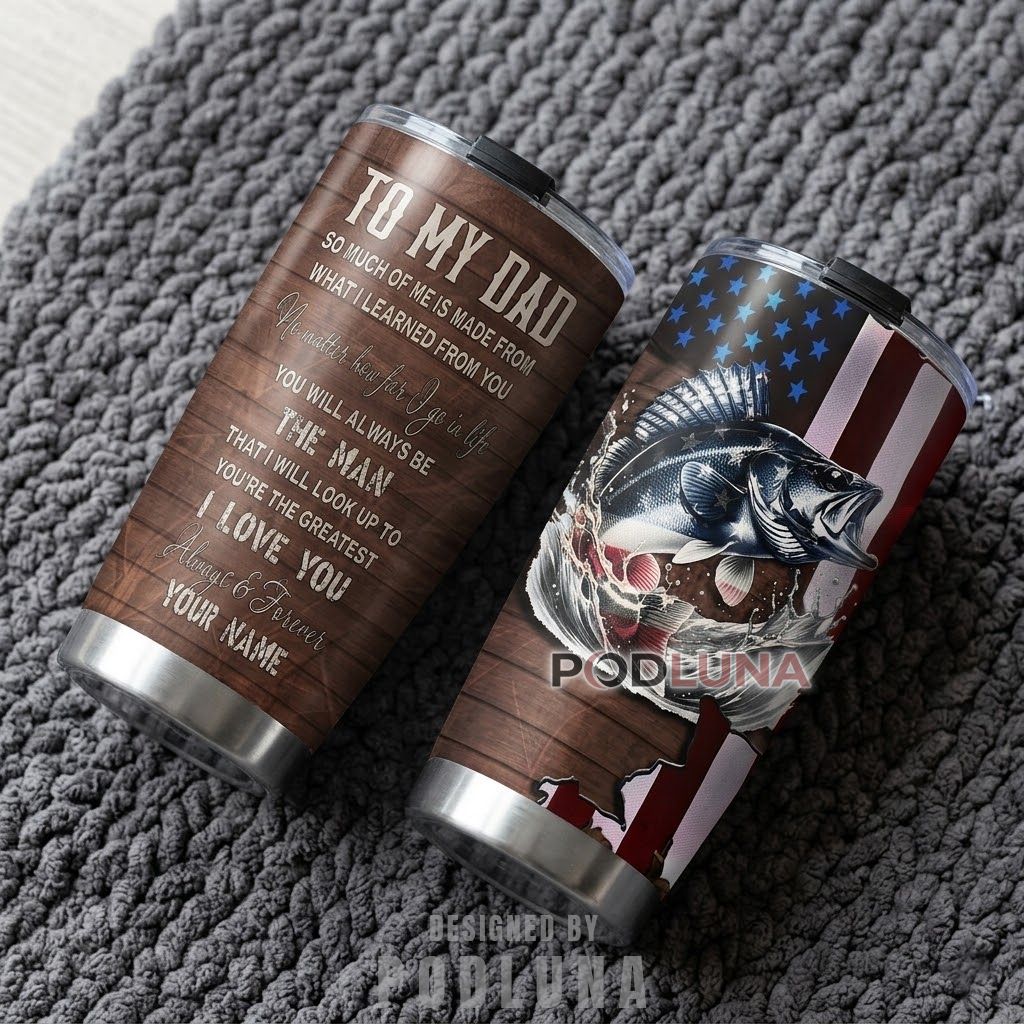 This To My Dad personalized fishing tumbler was made for the child who wants to give their father something that carries the full weight of what he has meant across a lifetime, featuring a two-sided full-wrap design with a warm dark wood-grain panel on one side bearing the message “To My Dad, So Much Of Me Is Made From What I Learned From You, No Matter How Far I Go In Life You Will Always Be The Man That I Will Look Up To, You’re The Greatest, I Love You Always and Forever” closing with a custom name in elegant script, and a dramatic bass fish breaking the water surface against a faded American flag backdrop on the other side. The heartfelt message paired with the fishing theme makes this personalized fishing dad Father’s Day tumbler the most complete gift for the father who taught both life lessons and how to read the water.