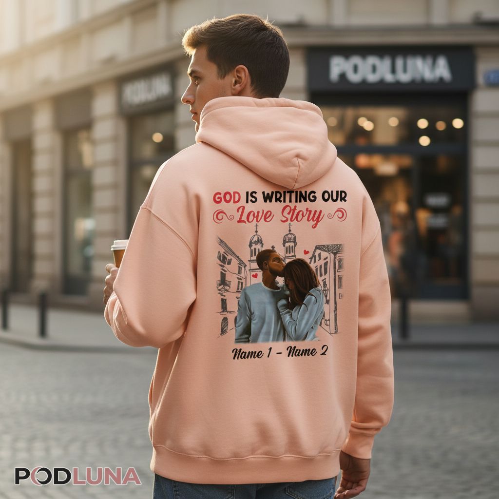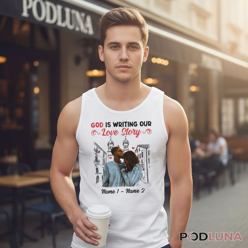 When you believe someone bigger is authoring your relationship, you wear that faith differently. Personalized God Is Writing Our Love Story Religious Couple Shirt from Podluna gives Christian couples a way to declare divine authorship over their romance. Find this across T-shirts, V-necks, hoodies, long sleeves, sweatshirts, and crewnecks—all featuring “GOD IS WRITING OUR” in red and black caps, “Love Story” in flowing burgundy script with decorative flourishes, an illustrated couple embracing before a European church backdrop with scattered red hearts, and customizable names (“Name 1 – Name 2”) in elegant script below.