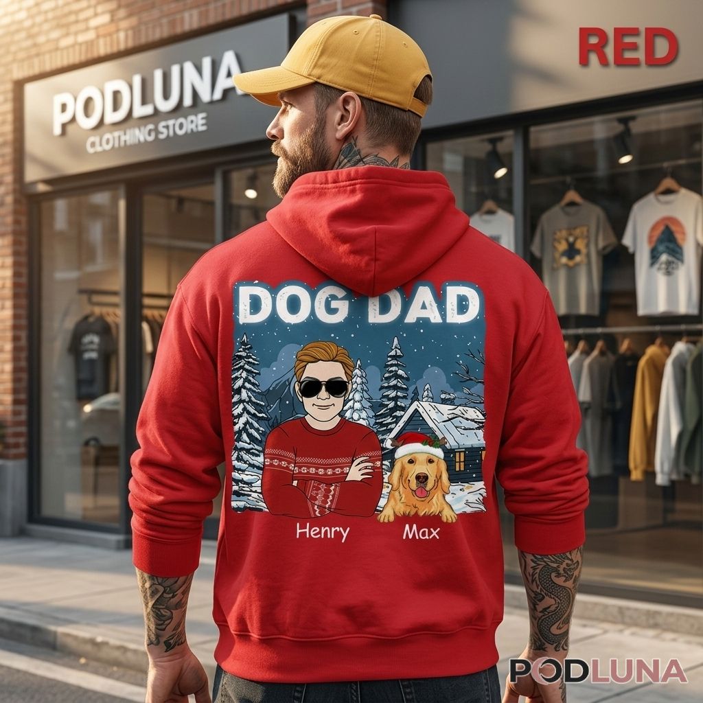 The Personalized Dog Dad Christmas shirt captures the coziest holiday portrait any dog owner and his golden retriever have ever shared on a t-shirt. The design features a cartoon illustration of a man in a red Christmas sweater standing arms crossed beside his golden retriever wearing a Santa hat, both named below their figures, set against a full winter scene of snow-covered pine trees, a lit cabin, and falling snow. “DOG DAD” leads boldly across the top in distressed winter lettering, the whole composition radiating the specific warmth of a Christmas evening spent exactly where he wants to be.