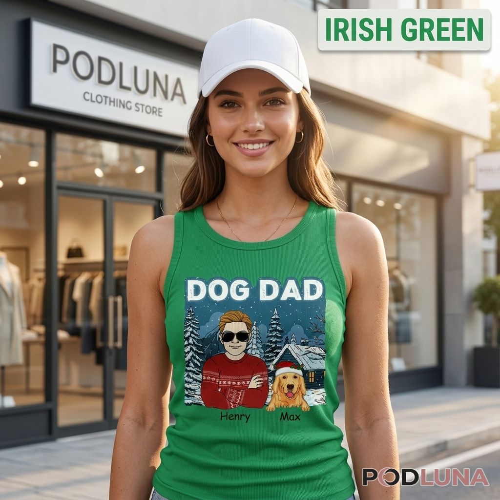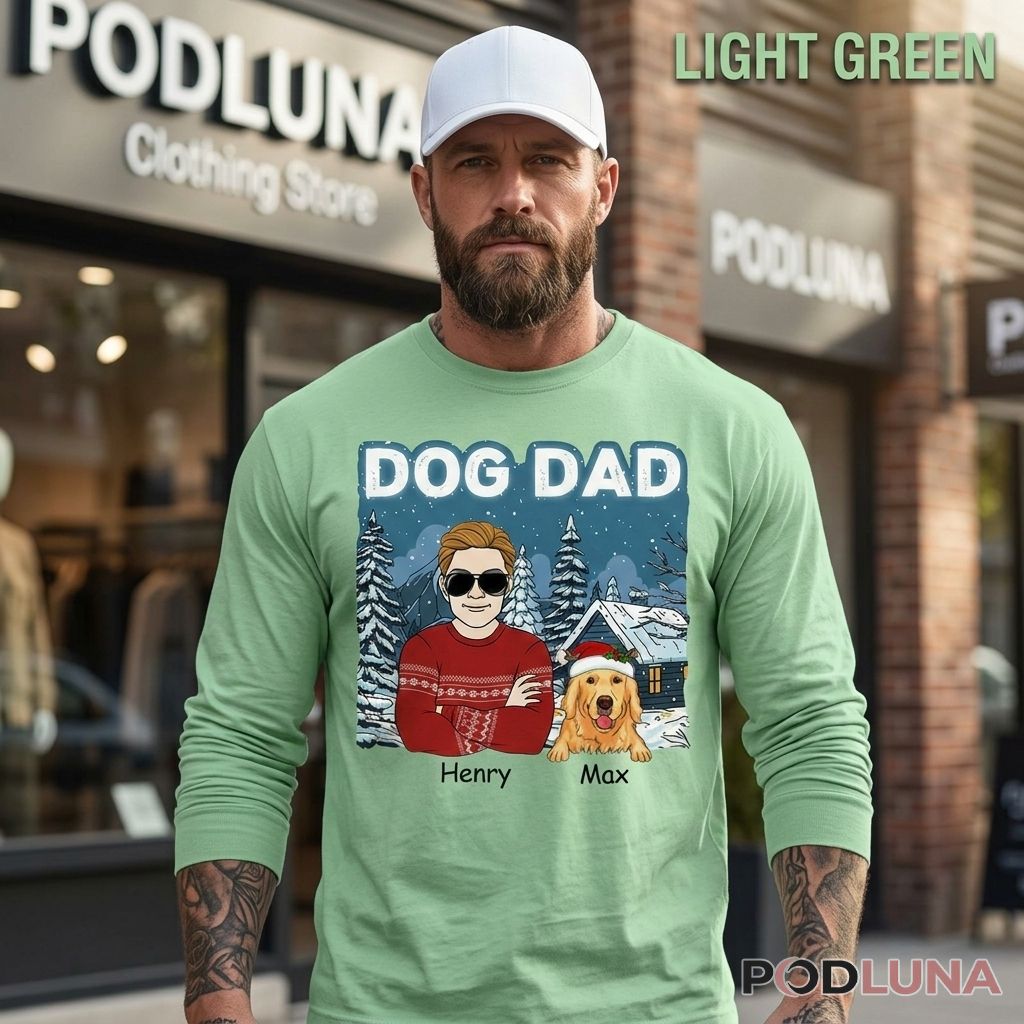 This personalized dog dad Christmas shirt is a festive dog owner t-shirt and thoughtful holiday gift designed for golden retriever lovers who celebrate the season with their canine companion front and center. For the pet owner whose dog is already the best part of every day, having that loyal companion dressed for the holidays and named beside him makes this the most personal Christmas gift he could receive. The winter cabin backdrop sets the scene. The Santa hat on the dog seals it completely. Podluna designed this custom Christmas dog dad shirt as the holiday gift that works perfectly under the tree for any dog lover whose dog makes every season better simply by being there. Order it with his name and his dog’s name for the most festive portrait his golden retriever has ever starred in.