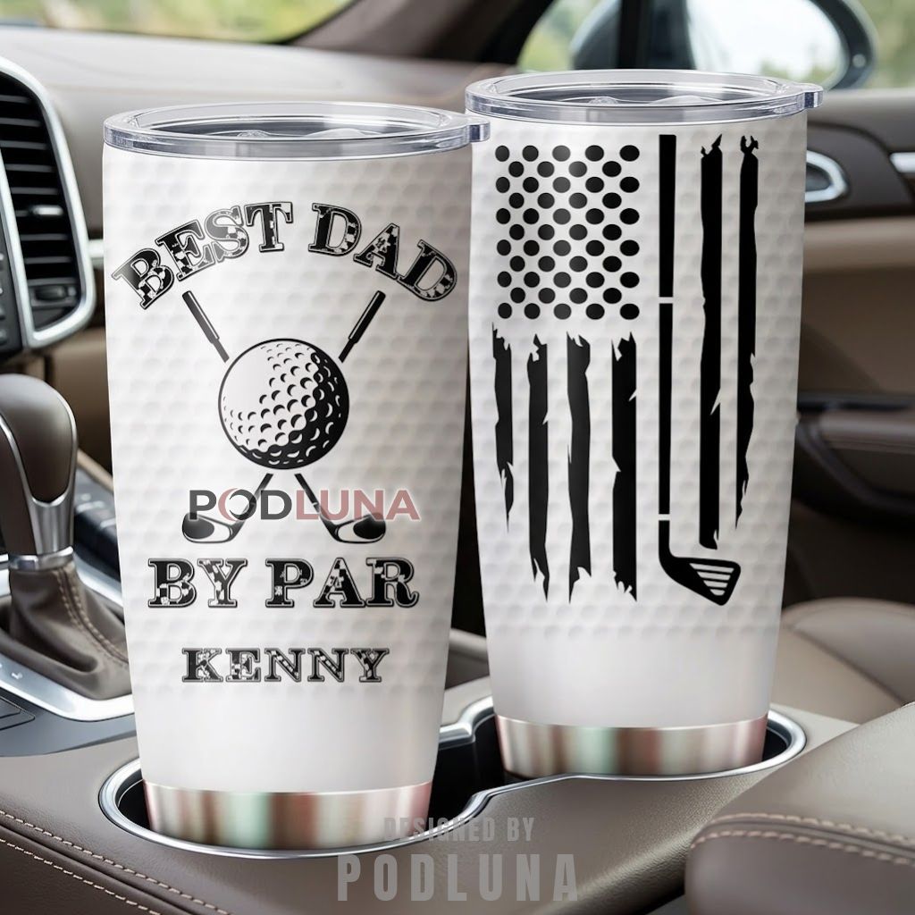 This Best Dad By Par personalized golf tumbler was made for the father who measures most things in life with the same precision he brings to his short game, featuring a two-sided design with a golf ball texture background on one side bearing crossed golf clubs, a large detailed golf ball, “Best Dad By Par” in bold distressed lettering, and a custom name centered below, while the other side carries a dramatic distressed American flag where the stripes are replaced by golf clubs and the stars field by a golf ball dimple pattern in a monochrome treatment that gives the whole piece a sleek, course-ready aesthetic. The golf pun and clean black-on-white design make this personalized golf dad Father’s Day tumbler the most cleverly specific gift for the dad whose weekend plans are always weather-dependent.