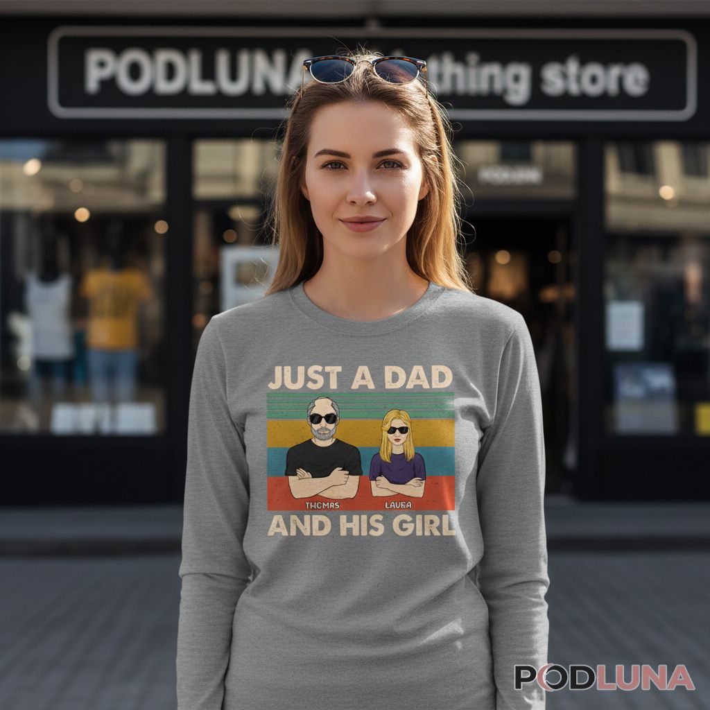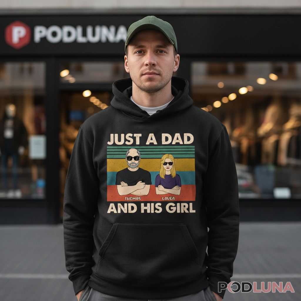 Just a dad and his girl—no elaborate explanations needed for a relationship that defines both their lives, where matching sunglasses attitudes reflect the mutual respect and love that makes this bond irreplaceable. This personalized dad daughter shirt captures that simplicity with custom illustrations and retro styling that honors the cool factor they share. Designed for fathers proud of their daughters or daughters shopping for personalized gifts for dads who appreciate the special connection, Podluna’s Personalized Just A Dad And His Girl Custom Name Shirt delivers nostalgic recognition of this dynamic duo. The customizable characters and names ensure each shirt is unique to the family while the retro sunset background adds vintage charm that appeals across generations. Popular for Father’s Day when daughters want to celebrate the partnership, daddy-daughter dance events where matching cool is required, or casual family photos where the shirt becomes part of the visual story of their relationship.