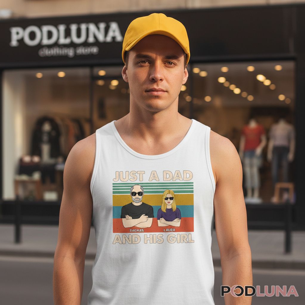 A sweet personalized celebration of the father-daughter duo appears on this t-shirt featuring custom cartoon illustrations and retro styling. The design features “JUST A DAD” at the top in bold cream uppercase letters. Below, two illustrated cartoon characters stand side by side wearing sunglasses and crossed arms in matching cool poses against a vintage sunset background with horizontal stripes in green, golden yellow, teal, and coral red that create a retro 1970s aesthetic. The characters represent dad and daughter with customizable name labels “THOMAS” and “LAURA” beneath each figure. At the bottom, “AND HIS GIRL” appears in matching cream bold letters that complete the simple yet powerful statement about their relationship. The combination of retro sunset vibes, personalized characters, and straightforward messaging creates a design that celebrates the special bond between fathers and daughters who share more than DNA—they share style, attitude, and an unbreakable connection.