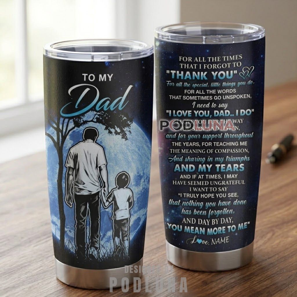 The Podluna Personalized To My Dad Tumbler is a stainless steel skinny tumbler built to carry an emotional message from child to father, wrapped in a deep galaxy-blue design featuring a father and son silhouette standing beneath a glowing full moon. Bold teal and white typography layers across the surface line by line, moving from a quiet acknowledgment of forgotten thank yous to a final declaration of love, with a personalized name signed at the bottom to make it entirely his.