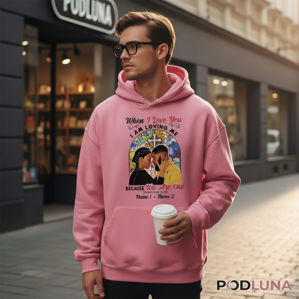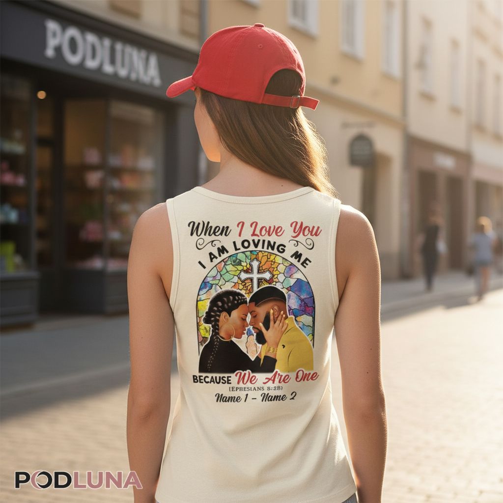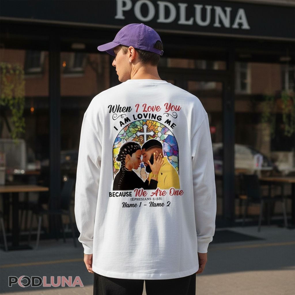 Christian couples searching for meaningful Valentine’s apparel will appreciate this When I Love You I Am Loving Me design that grounds romance in biblical truth. The stained glass window backdrop frames an intimate couple portrait, while Ephesians 5:28 grounds the message in scripture. Available as a t-shirt, hoodie, sweatshirt, long sleeve, or tank top with personalization options that let you add both names for a custom Valentine’s gift reflecting your faith journey together.