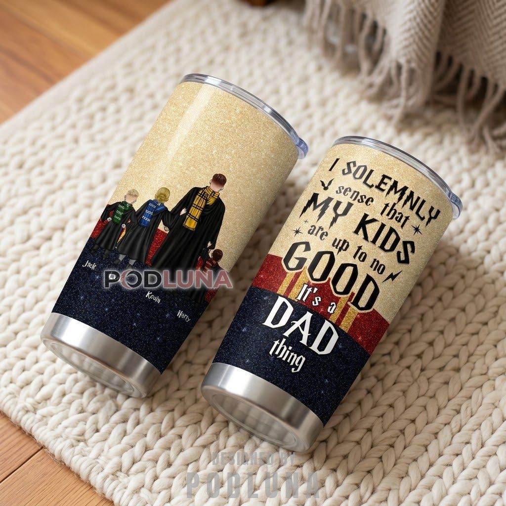 This I Sense That My Kids Are Up To No Good It’s A Dad Thing personalized wizard tumbler was made for the father who raised a house full of little mischief-makers and would not have it any other way, featuring a two-sided full-wrap design with a wizard dad in a black robe and gold house scarf standing with his back turned to a group of children each wearing robes in different house colors with their custom names labeled below on a gold glitter background, and the phrase “Sense That My Kids Are Up To No Good, It’s A Dad Thing” in magical lightning-bolt typography across a tri-color gold, red, and navy glitter panel on the other side. The wizarding world aesthetic and custom child name personalization make this fantasy dad Father’s Day tumbler the most specific and delightful gift for the father whose household has always operated at full chaos capacity.