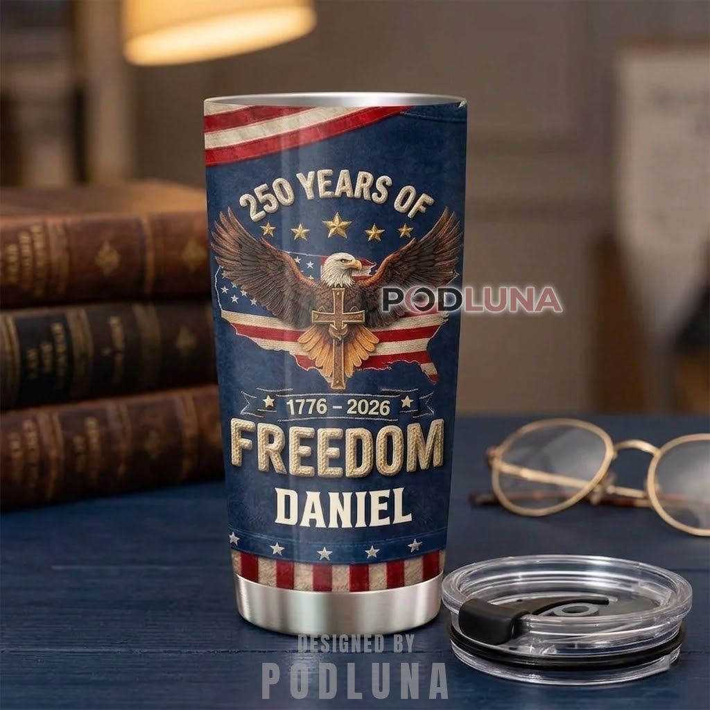 This 250 Years of Freedom Eagle Cross personalized tumbler was crafted for anyone who marks America’s semiquincentennial through both faith and patriotism in the same breath, featuring a full-wrap design centered on a bald eagle gripping a golden cross with wings fully spread against a deep navy and distressed American flag background, framed by gold stars and “250 Years Of” arching above, with “1776-2026 Freedom” in bold embossed-style lettering and a custom name stamped beneath in the same gold treatment that gives the entire piece the weight of a personal commemorative medallion. The faith and freedom composition and the name personalization make this America 250th anniversary Christian patriotic tumbler a gift built to be kept, not just used.