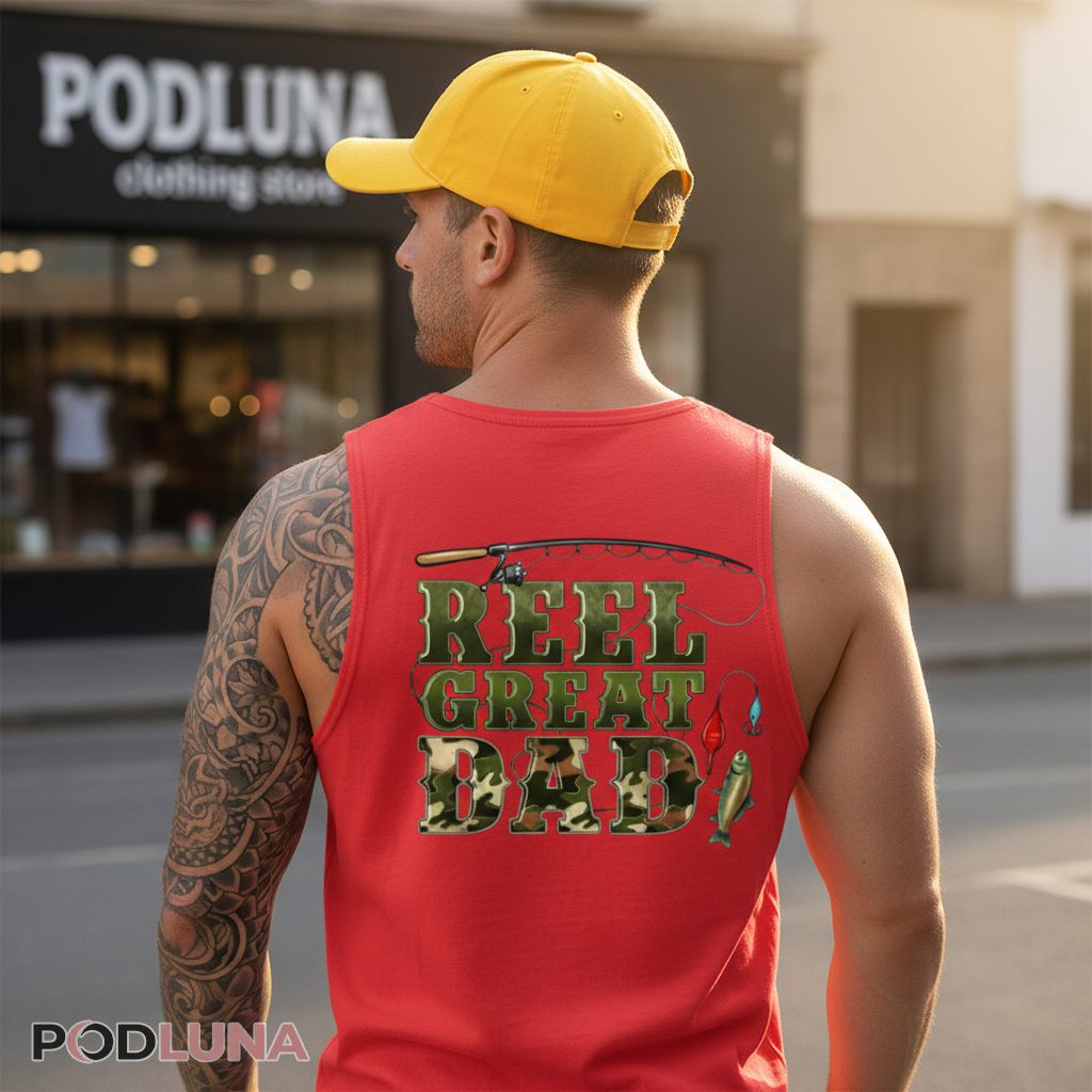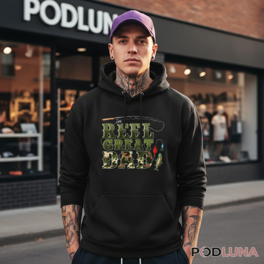 A creative fishing pun tribute appears on this t-shirt celebrating fathers who are both great dads and great anglers. The design features “REEL GREAT DAD” stacked vertically with each word on its own line. The letters are filled with camouflage pattern in shades of olive green and tan that appeals to outdoorsmen. Above the text, a detailed fishing rod illustration curves across the top with realistic reel, guides, and line details. Various fishing lures dangle from the line including colorful bobbers and tackle in red, blue, and natural tones. The word “REEL” creates the clever pun—using the fishing equipment term instead of “REAL” to make the tribute both literally about fishing and figuratively about dad’s greatness. The combination of camo lettering, fishing rod graphics, and dangling lures creates a design packed with angling imagery that celebrates fathers who’ve passed down fishing wisdom to the next generation.