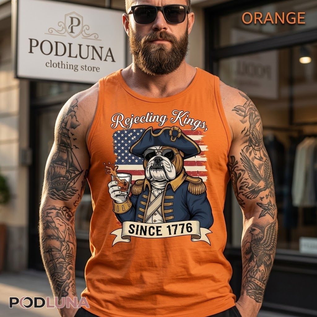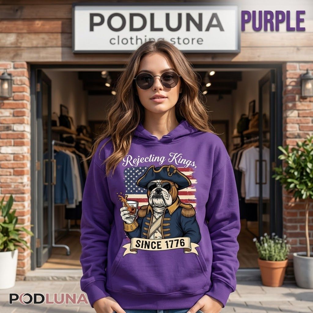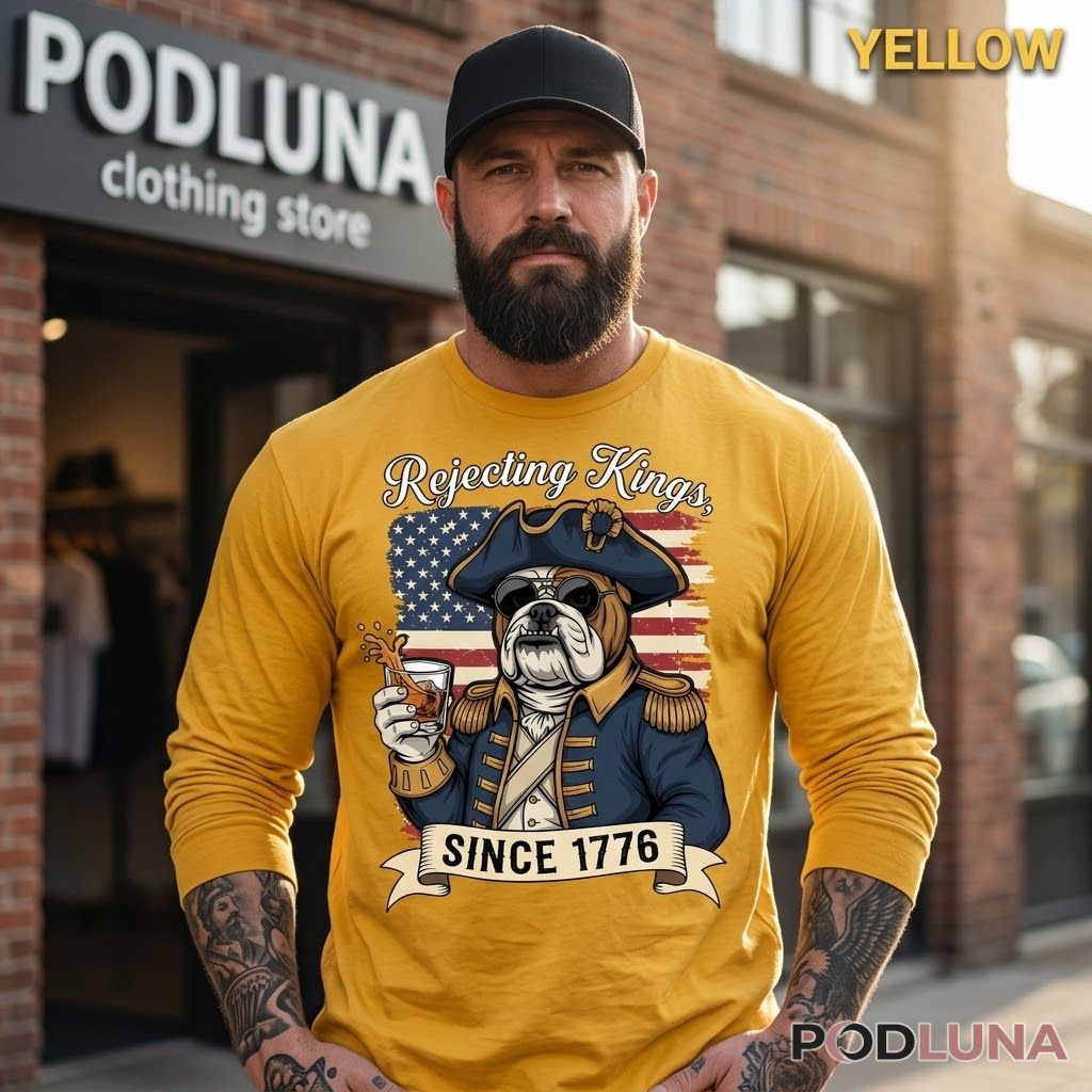 This Rejecting Kings Since 1776 patriotic shirt is built for anyone who wears their American independence as a personal philosophy, featuring a bulldog dressed in full colonial military uniform complete with tricorn hat, epaulettes, and aviator sunglasses, raising a splashing drink in front of a distressed American flag while a ribbon banner below reads “Since 1776” in a bold vintage proclamation style. The combination of revolutionary attitude and irreverent bulldog energy makes this Independence Day graphic tee feel like history with a personality.