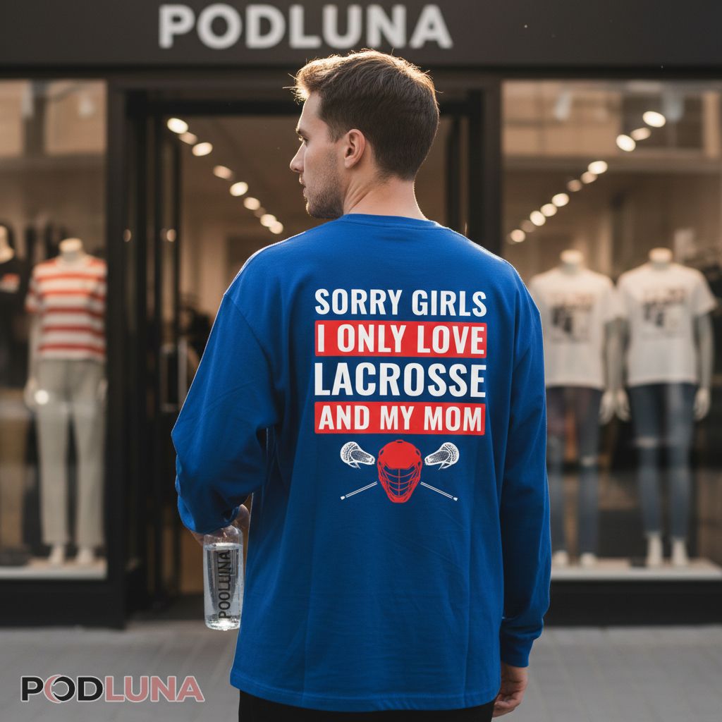 This casual crewneck t-shirt showcases bold typography in a stacked, center-aligned layout with alternating white and red text against a rich forest green background. The Sorry Girls I Only Love Lacrosse And My Mom Shirt features a striking message printed in uppercase sans-serif lettering, creating strong visual contrast and immediate readability. Below the text, a graphic arrangement displays lacrosse equipment including a red protective helmet positioned between two crossed lacrosse sticks with traditional netted heads. The design employs a straightforward printing approach with clean lines and minimal embellishment, allowing each element to stand out clearly. Red rectangular bars highlight key phrases, adding geometric structure to the overall composition while reinforcing the color scheme throughout.
