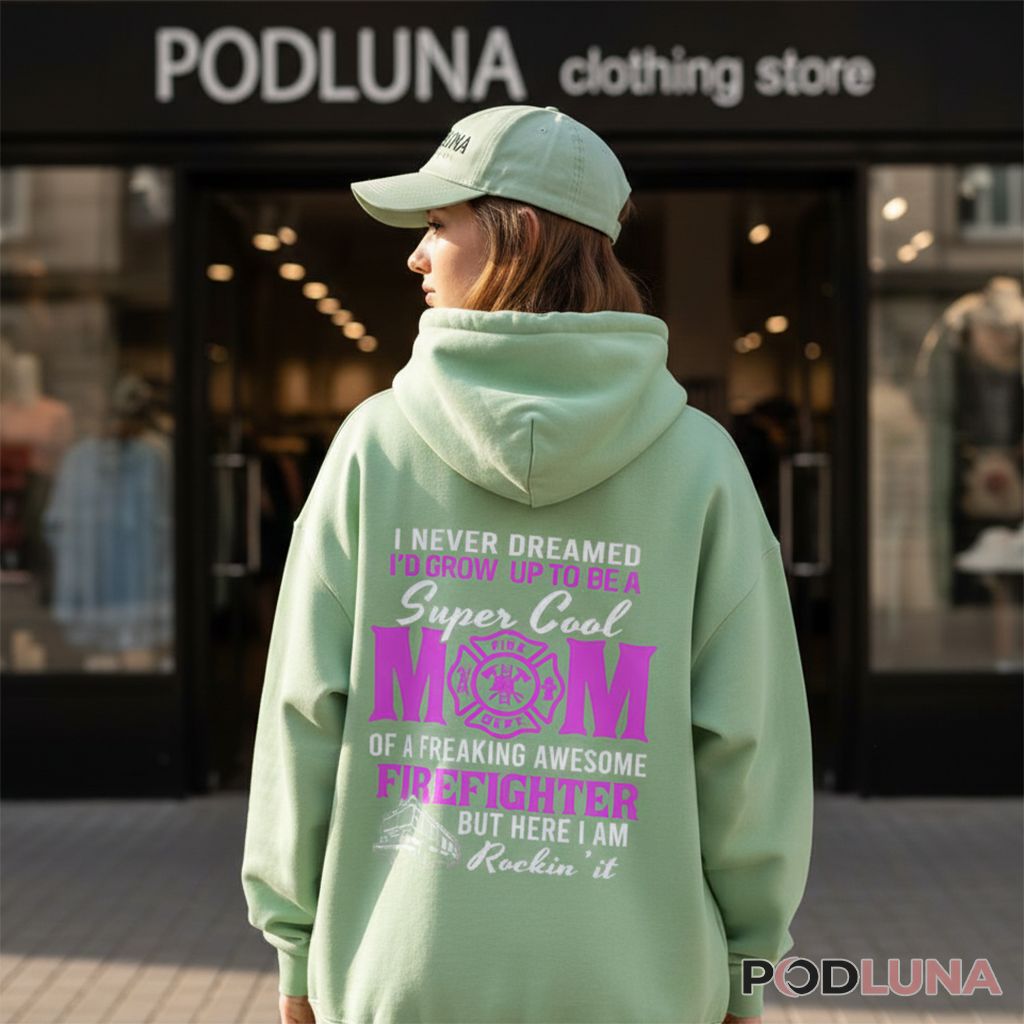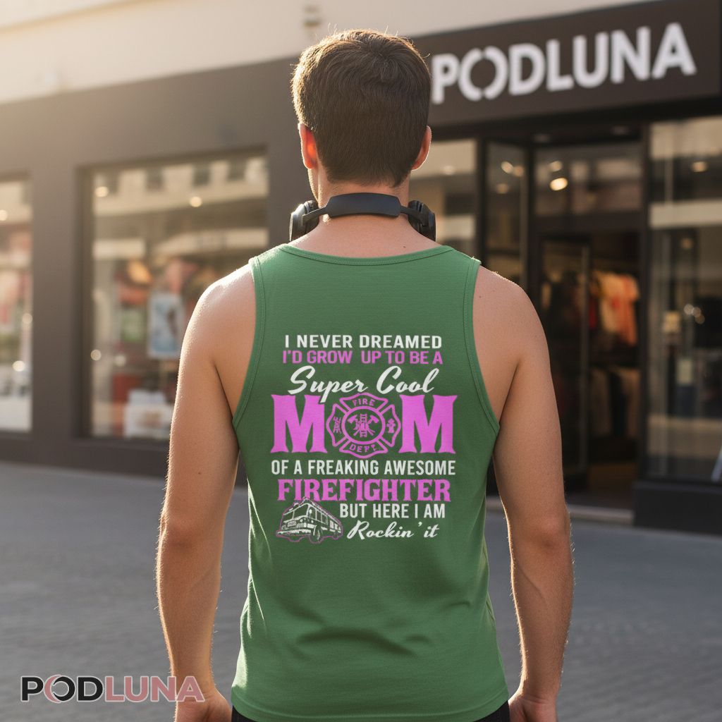 Bold typography and firefighter imagery fill this t-shirt celebrating a mother’s pride in her first responder child. The message begins with “I NEVER DREAMED I’D GROW UP TO BE A” in white text at the top. “Super Cool” follows in flowing white script, leading into “MOM” in large hot pink block letters that flank a firefighter Maltese cross emblem. The cross features traditional fire department iconography with ladder, axe, and helmet details. Below “MOM,” the phrase continues: “OF A FREAKING AWESOME FIREFIGHTER” mixing white and pink text for emphasis. At the bottom, “BUT HERE I AM Rockin’ it” completes the sentiment, accompanied by a fire truck illustration. The design stacks vertically with varying font sizes, mixing script, block, and serif styles while using pink accents to emphasize key words.