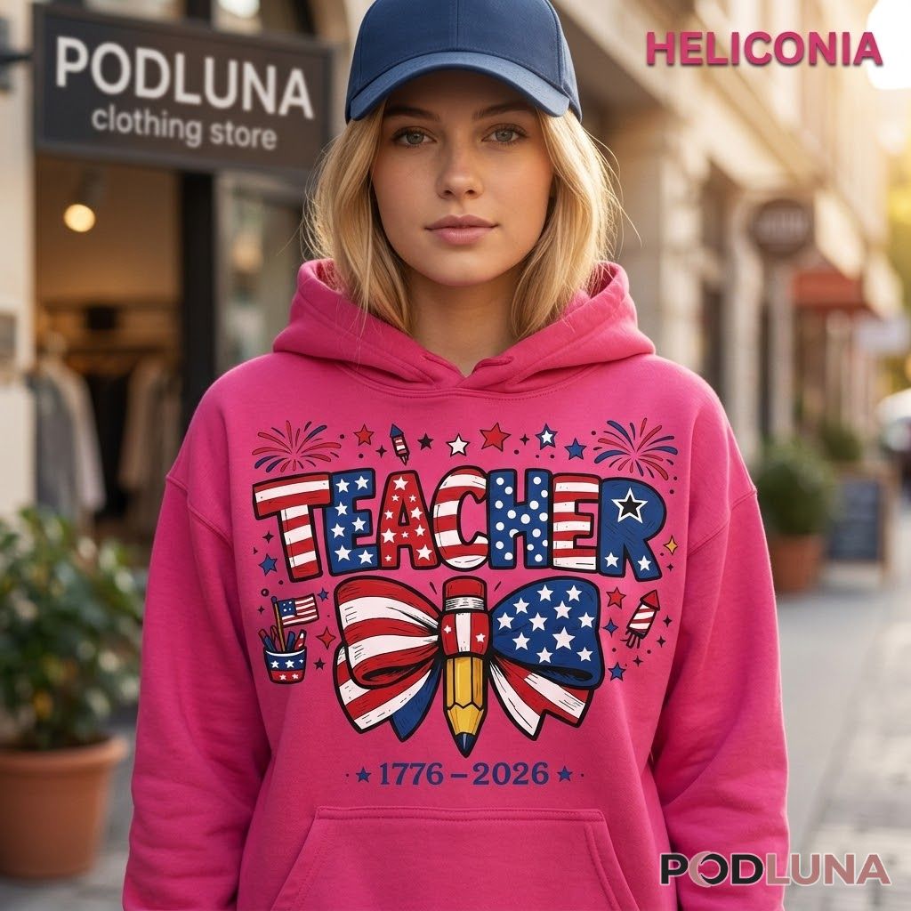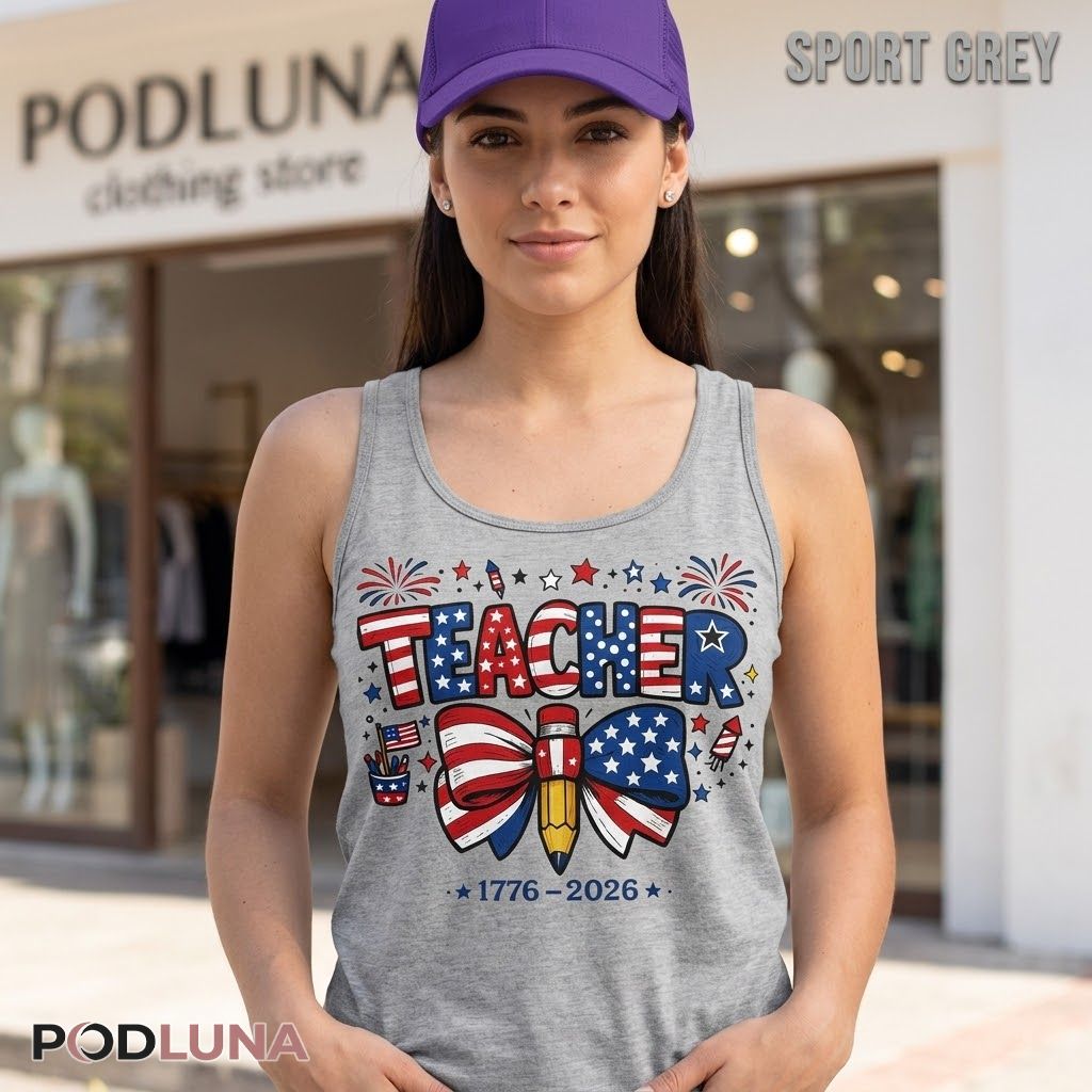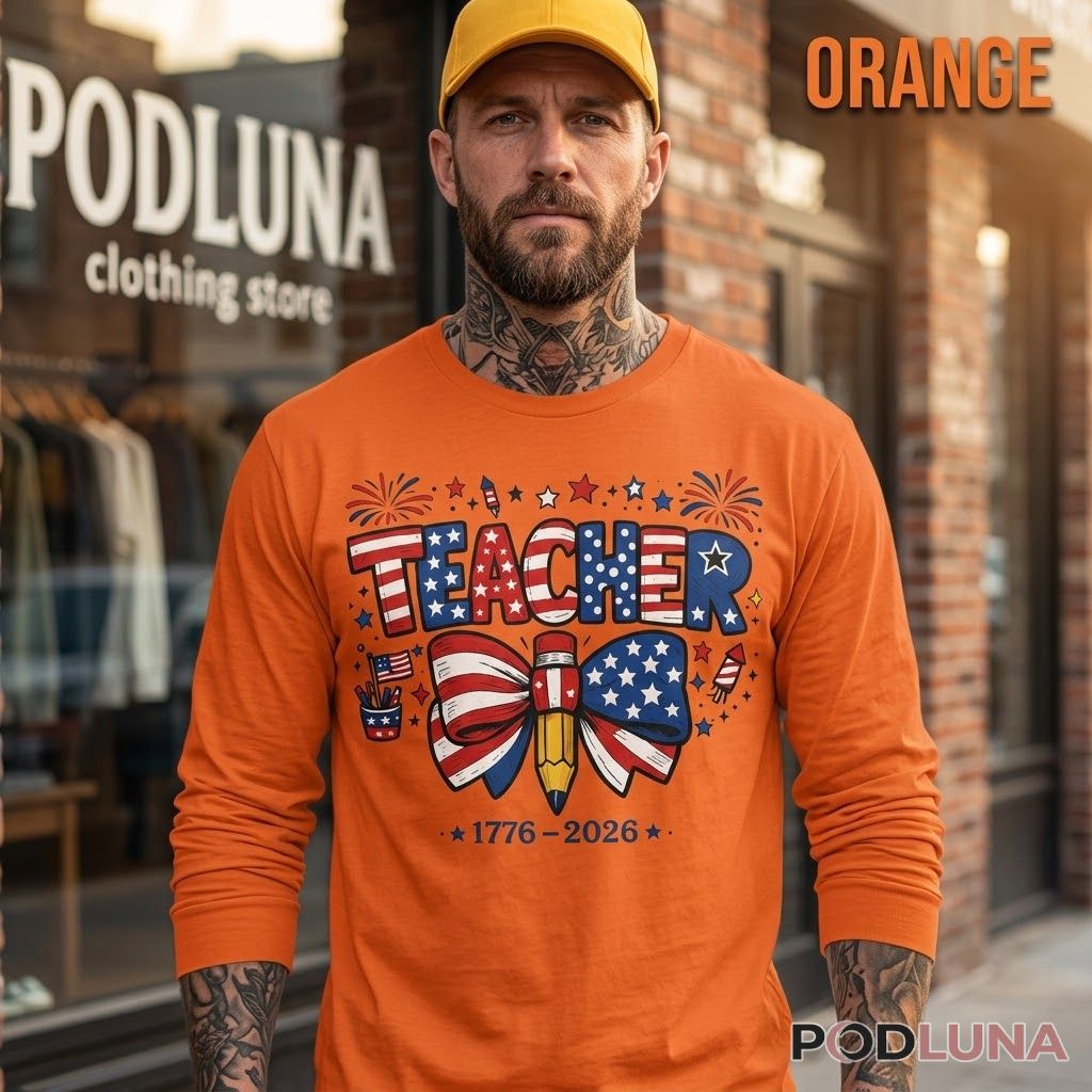 This patriotic teacher 4th of July shirt was designed for educators who bring the same pride to their classroom as they do to every Independence Day celebration, featuring bold stars-and-stripes lettering spelling “TEACHER” above a large decorative bow tied around a pencil rendered in American flag colors, flanked by a cup of patriotic pencils, fireworks, and the milestone dates “1776-2026” along the bottom in a cheerful, hand-drawn illustration style. The classroom details woven into the patriotic design make this teacher Independence Day graphic tee feel genuinely personal rather than simply festive.