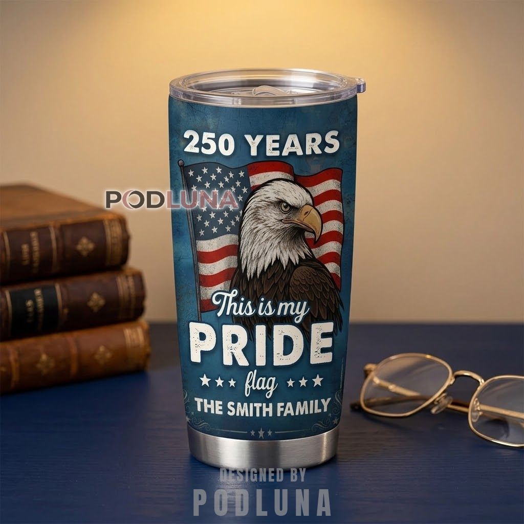 This 250 Years This Is My Pride Flag personalized family tumbler was made for anyone who wants to mark America’s semiquincentennial with something that carries the family name alongside the milestone, featuring a full-wrap design centered on a hyper-detailed bald eagle portrait set against a distressed vintage American flag on a deep steel-blue background, with “250 Years” arching boldly across the top, “This Is My Pride Flag” in layered mixed typography at the center, and a custom family name in elegant script along the bottom that transforms a commemorative drinkware piece into a genuine family heirloom. The rugged vintage aesthetic and deeply personal customization make this America 250th anniversary family tumbler a gift that outlasts every party supply purchased for the occasion.