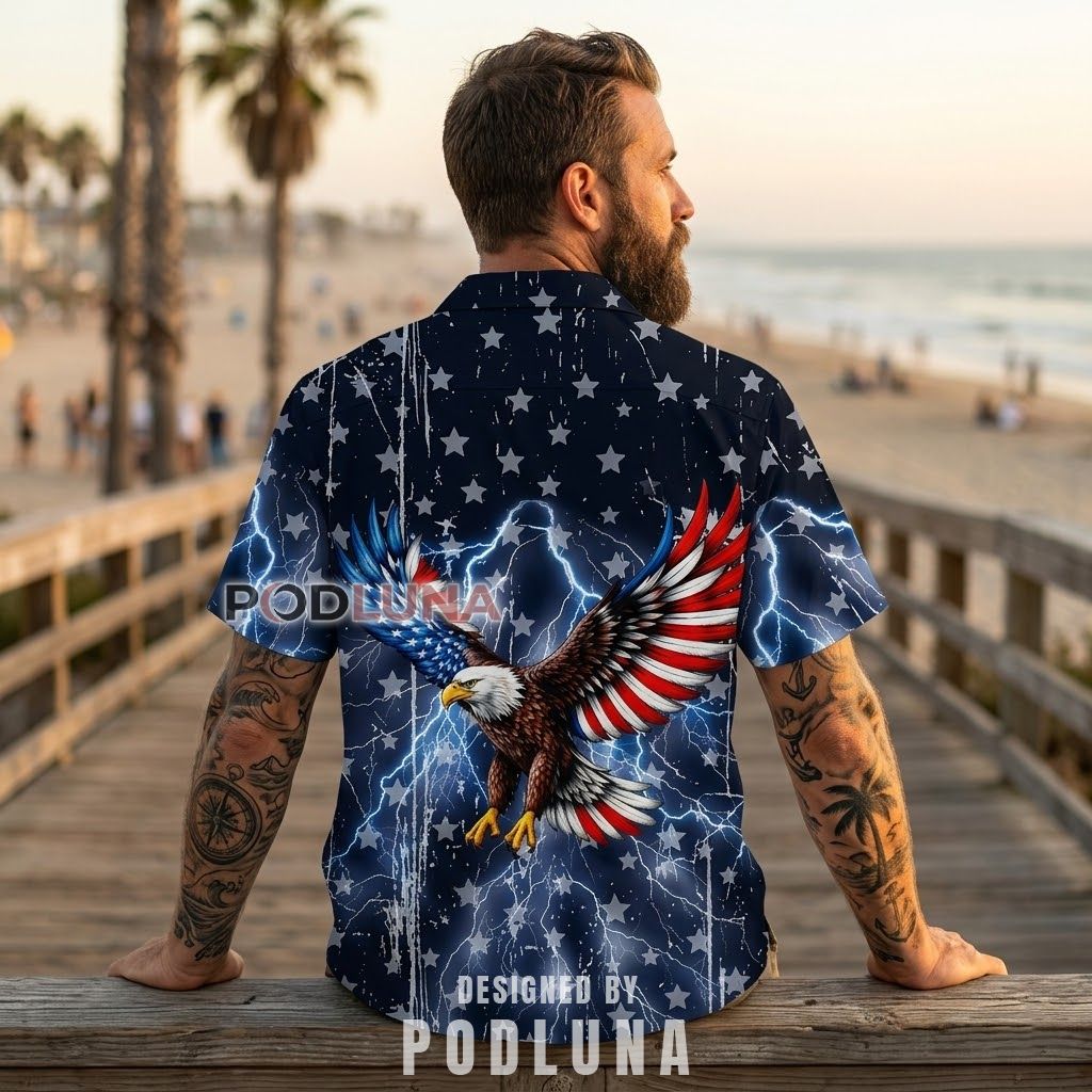 This is not a shirt you wear to blend in. The lightning backdrop gives it a force that most patriotic Hawaiian shirts never reach, and the eagle mid-dive makes sure every angle of the design earns its place. Podluna created this one for the patriot who marks Independence Day not just with fireworks but with a full commitment to looking the part from the moment they walk out the door.
