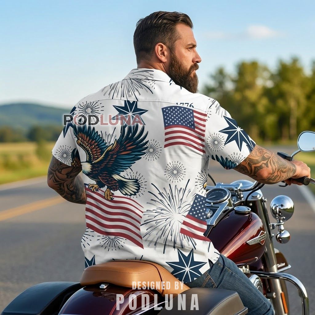The design language here is intentional — the white canvas lets the navy stars and eagle artwork breathe without competing for attention, while the fireworks bursts scattered across the fabric give the whole print a kinetic, celebratory energy that feels like the Fourth of July at its best. The eagle isn’t decorative; it’s the centerpiece, wings fully extended, flag trailing below, rendered with enough detail to reward a second look. Podluna treated the 250th milestone as exactly what it is: a once-in-a-lifetime moment that deserves artwork, not a logo.