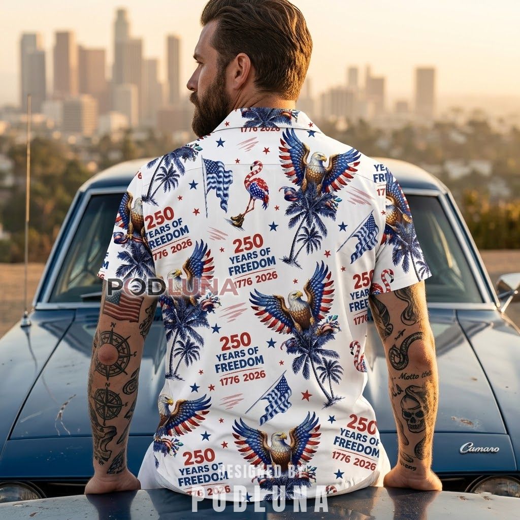 Designed for those who wear their national pride like a second skin, this USA 250th Anniversary Hawaiian Shirt delivers a bold, all-over graphic print featuring soaring bald eagles with wings spread wide, classic palm trees, and the commemorative “250 Years of Freedom — 1776 2026” typography rendered in striking red and navy across a crisp white base. Every inch of this patriotic graphic tee celebrates a once-in-a-generation milestone with the kind of confident visual energy that turns heads at any gathering.