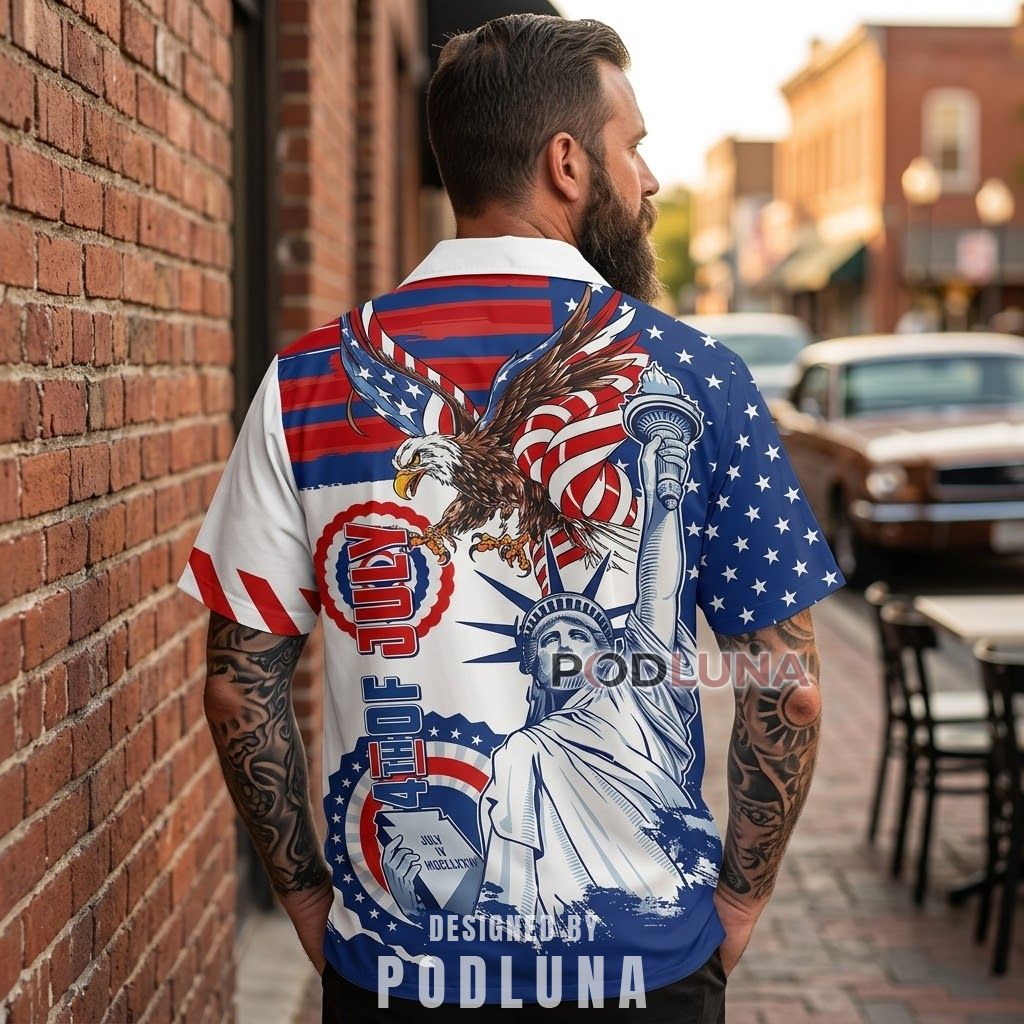 Few patriotic shirts carry this much American iconography without feeling cluttered, and the USA 4th of July Liberty Eagle Hawaiian Shirt pulls it off with a design that pairs the Statue of Liberty, a soaring bald eagle, and bold 4th of July typography across a split star-and-stripe layout that feels like Independence Day in every thread.