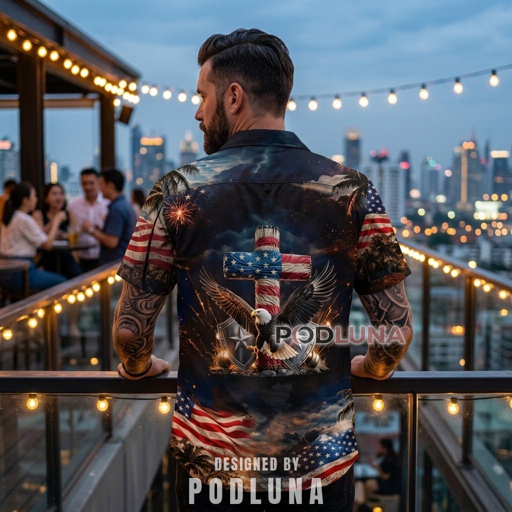 This patriotic Christian Hawaiian shirt belongs at Fourth of July church gatherings, commemorative events, rooftop celebrations, and any summer occasion where faith and national pride share equal standing in the room. The dark all-over print gives it an elevated, evening-ready quality that transitions naturally from a daytime parade to a rooftop party under string lights without losing any of its presence. It commands attention without asking for it.