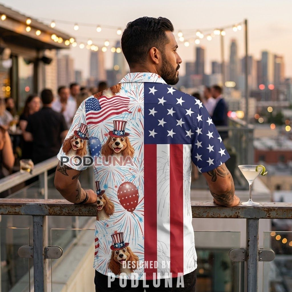 For the dog parent shopping for a funny Father’s Day and Independence Day gift combination, the Spaniel lover who needs something that finally acknowledges both their patriotism and their actual family structure, or anyone who wants a 4th of July Hawaiian shirt that tells a complete story the moment someone reads the chest pocket, this one is the clear answer.