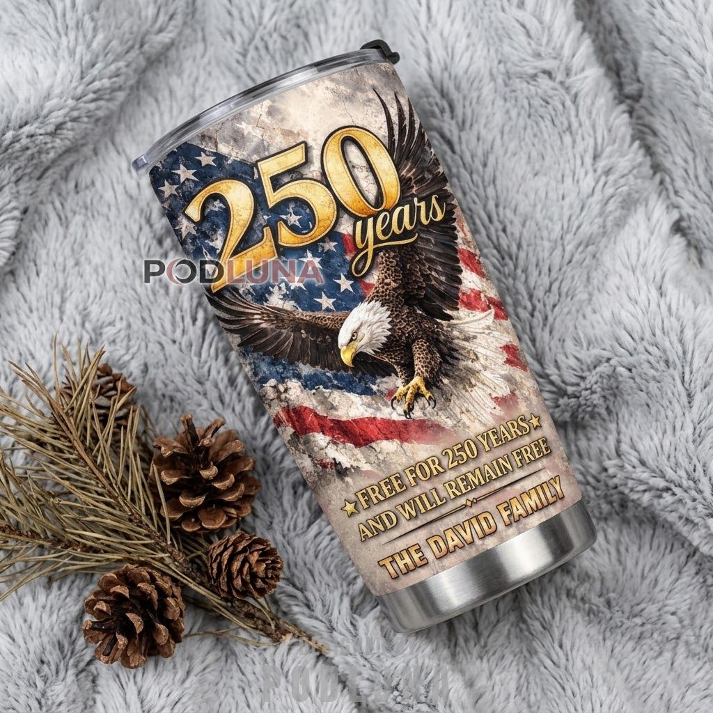 This Free For 250 Years And Will Remain Free personalized family tumbler was crafted for anyone who treats American independence as a living conviction rather than a historical footnote, featuring a dramatic full-wrap design with a soaring bald eagle bursting through a weathered stone-textured American flag backdrop, bold golden “250 Years” typography commanding the upper half, and the declaration “Free For 250 Years And Will Remain Free” set above a custom family name plate in a composition that feels closer to a monument than a drinkware piece. The distressed vintage treatment and defiant message make this America 250th anniversary personalized tumbler one of the most powerful commemorative gifts of the milestone year.