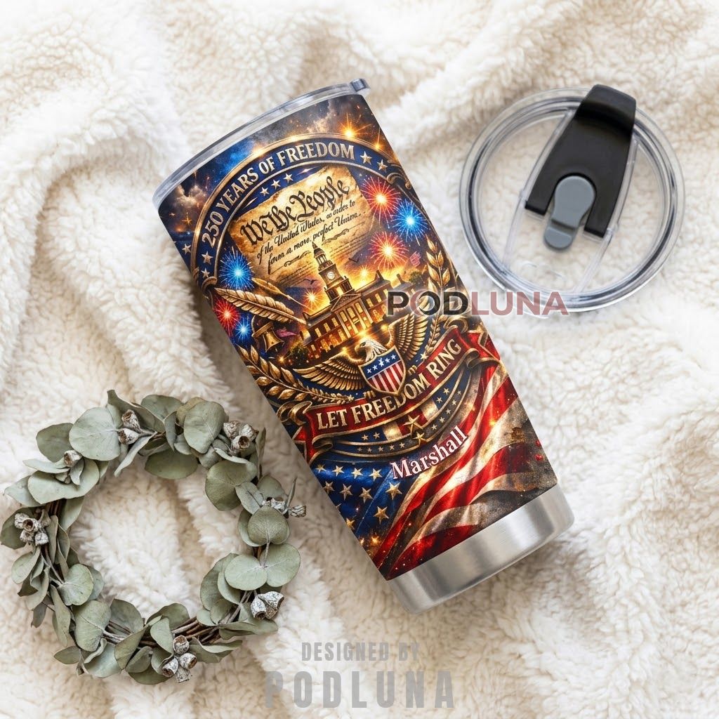 This We The People America 250 personalized tumbler is made for anyone who wants to carry the weight of the milestone in their hands every single day, featuring a stunning full-wrap design centered on an illuminated Independence Hall beneath a glowing “We The People” Constitution scroll, framed by a golden laurel wreath, a spread-eagle shield emblem, a red banner reading “Let Freedom Ring,” and a sweeping American flag base, all arched by “250 Years of Freedom” at the top and finished with a custom name in gold script that turns a commemorative piece into something genuinely personal. The cinematic depth and museum-quality illustration make this personalized patriotic tumbler one of the most meaningful America 250th anniversary gifts of the year.